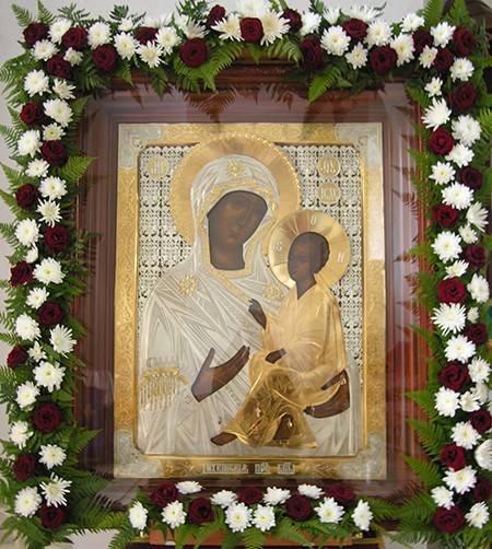 Днесь верных собори просвещаются, еретическая же ополчения посрамляются, видяще икону Твою, Владычице, яко солнце, по воздуху шествующу, нечестия мглу потребляющу и верныя просвещающу.