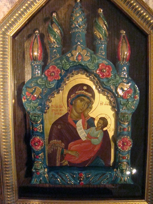 Ра́дуйся, в ве́ре благочести́выя сохраня́ющая; ра́дуйся, не почита́ющих ико́ны Твоя́ святы́я, я́ко прах, от лица́ земли́ развева́ющая.