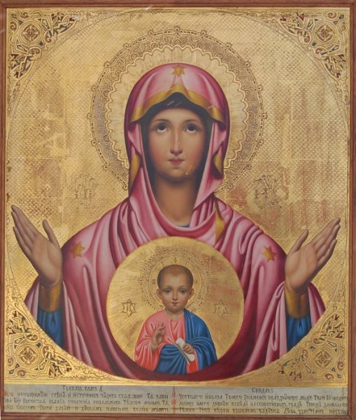Икона Божией Матери, именуемая "Знамение", изображает Пресвятую Богородицу, сидящую и молитвенно подъемлющую руки Свои; на груди ее, на фоне круглого щита (или сферы) - благословляющий Божественный Младенец - Спас-Эммануил. Такое изображение Богоматери относится к числу самых первых Ее иконописных образов. В усыпальнице святой Агнии в Риме есть изображение Богоматери с распростертыми в молитве руками и с Младенцем, сидящим на Ее коленях. Это изображение относится к IV веку. Кроме того, известен древний византийский образ Богоматери "Никопеи", VI века, где Пресвятая Богородица изображена сидящею на троне и держащею обеими руками перед собой овальный щит с образом Спаса-Эммануила. Иконы Божией Матери, известные под именем "Знамение", появились на Руси в XI - XII веках, а называться так стали после чудесного знамения от Новгородской иконы, случившегося в 1170 году.