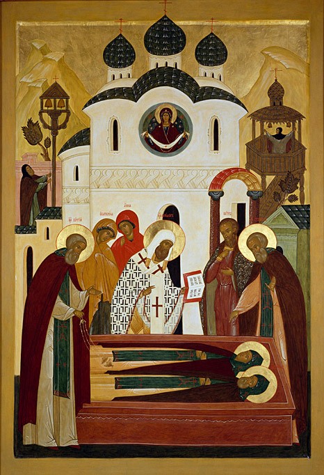 Над благодатными мощами прп. Кирилла и Марии Радонежских чудотворцев помещена другая дорогая реликвия Покровского Хотькова монастыря – икона Сергиева рода, которая воплотила в себе идею Небесного покровительства над нашей богохранимой страной и напоминает нам об устоях доброй христианской семьи, над которой простирает Свой Омофор Царица Небесная. Этот вдохновенный образ святого семейства соединяет собой земное время и вечность, пространство земли в ограде Церкви и Горний мир, Отечество Небесное и Отечество земное. У гробницы благоверной четы предстоят преподобный Сергий, его брат и сподвижник преподобный Стефан с женой Анной, младший брат Пётр с супругой Екатериной, и внук Преподобных – святитель Феодор, мощи которого почивают в соборе Ростовского Кремля. Икона является зримой проповедью торжества взаимной любви и духовного единения, и зовёт нас к благодатному миру и святости под Покровом Царицы Небесной.