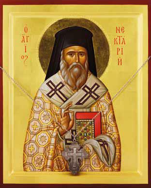 О, мироточивая главо, Святителю Нектарие, Архиерею Божий! Во времена великаго отступления, нечестию мир пленившу, благочестием просиял еси и главу прегордаго Денницы, уязвляющаго нас, сокрушил еси. Сего ради дарова ти Христос врачевати язвы.