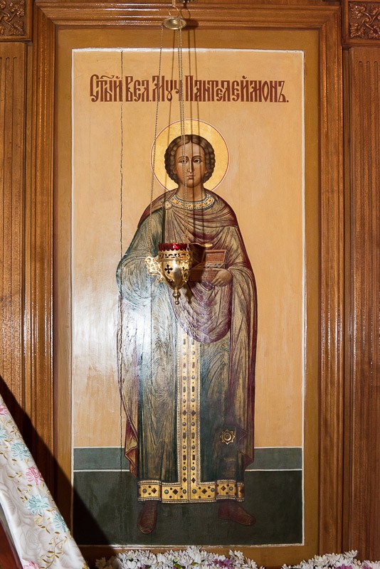 Икона великомученика и целителя Пантелеимона с частицей мощей в иконостасе.