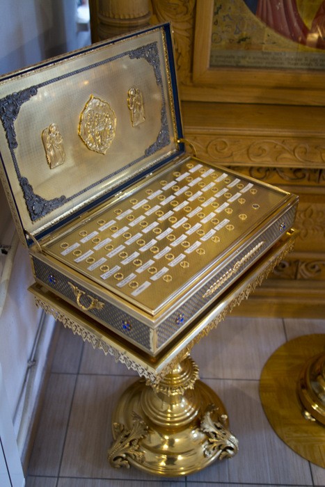 В большом ковчеге, расположенном в главном Знаменском храме, под стеклом находится 51 частица мощей следующих святых: