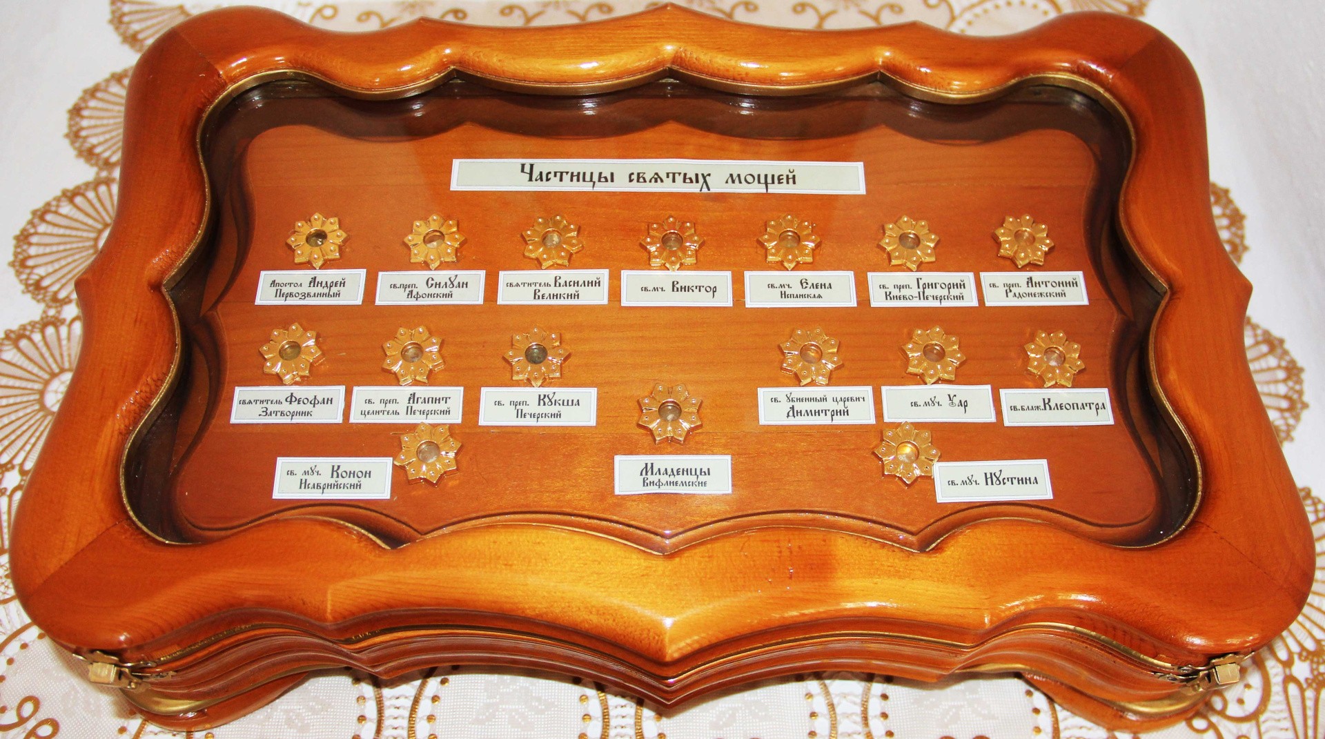 Частицы святых мощей: апостола Андрея Первозванного, преподобного Силуана Афонского, Святителя Василия Великого, мученика Виктора, мученицы Елены Испанской, преподобного Григория Киево-Печерского, преподобного Антония Радонежского, святителя Феофана Затворника, преподобного Агапита Печерского, преподобного Кукшы Печерского, Святого убиенного царевича Димитрия, мученика Уара, блаженной Клеопатры, мученика Конона Исаврийского, святых избиенных младенцев вифлиемских, мученицы Иустины.