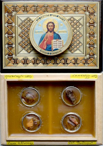 В ковчежце находятся мощи святителя Феодорита Рязанского, священномученика Мисаила Рязанского, святителя Гавриила (Городкова) и святителя Мелетия (Якимова).
