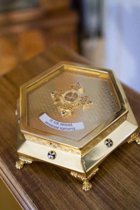 со стеклом с частицей мощей св. блаженного Василия Московского. Находится в придельном
