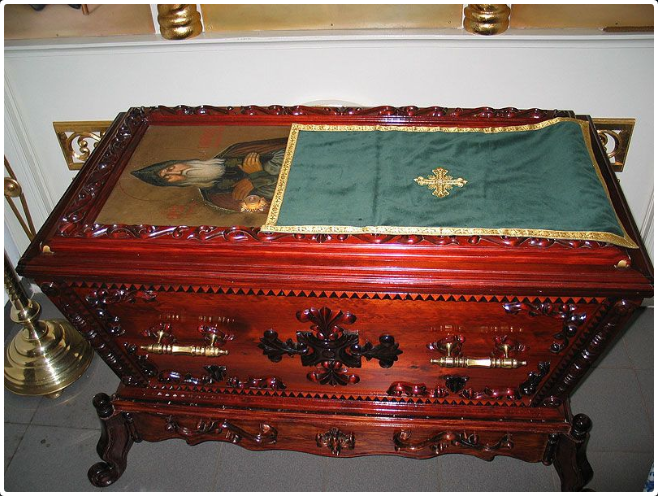 Его мощи были частично спасены от осквернения в советское время и сейчас часть их почивает в Седмиозерной пустыни, а остальная часть в церкви праведного Иоанна Кронштадтского г. Казани.