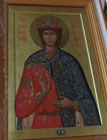 Икона святого благоверного князя Феодора Ярославича - брата святого Александра Невского была написана в 2008 году и тогда же в нее была вставлена частица святых мощей этого Новгородского князя. Авторы - Димитрий Мироненко и Ирина Бубнова. По словам Димитрия, икона была написана за четыре месяца. Иконография образа соответствует стилю изографов-современников святого князя, то есть традициям Новгородской школы XIII века. Это древняя техника безсанкирного письма. Особенности техники такого письма состоят в том, что художник приступает к вохрению сразу же по тональному рисунку, используя преимущества белого левкаса. В иконографии Новгородской школы иконописи XIIIв. явно прослеживались византийские традиции, среди князей и бояр была даже мода на все византийское. Поэтому, возможно, многие иконы этого периода для новгородских церквей писали греческие мастера. Величина киота (69Х93).