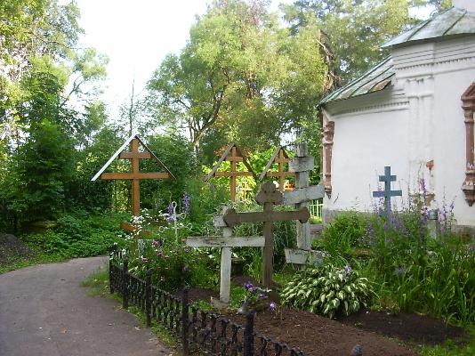 Снаружи рядом с алтарной апсидой, с северной ее стороны паломники увидят два деревянных, одинаковых по размеру надгробных креста, около которых прихожане часто зажигают свечи, служат молебны и возлагают цветы. Это могилы двух почитаемых в Тульской епархии старцев священника о. Афанасия Реутова, преставившегося в 1904 году, и схиархимандрита Христофора (Никольского), похороненного по его завещанию рядом с могилой о. Афанасия в 1996 году.