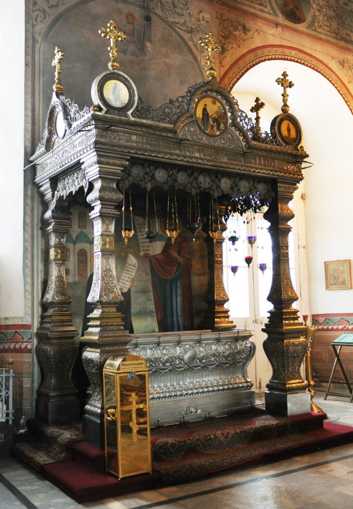 Настоятели всегда заботились о месте погребения преподобного. В Успенском соборе у северной стены возвышалась литая медная посеребренная рака. В начале XIX в. «по причине учинившейся впадины земли» гробница покосилась, поэтому она была сдвинута со своего места, а окружавшая ее решетка разобрана. В 1805 г. все это было приведено в порядок, причем истлевшые на гробнице покрывало («срачица») домотканого синего холста («крашенины») и «одежда» из темно-зеленого сукна были заменены новыми.