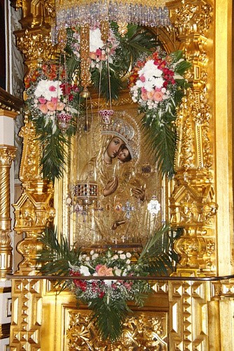 12 ав­гу­ста 1880 го­да ико­на бы­ла пе­ре­не­се­на в воз­вра­щен­ный мо­на­сты­рю Свя­то-Тро­иц­кий храм и по­ме­ще­на в де­ре­вян­ный рез­ной ки­от у его ле­вой пе­ред­ней ко­лон­ны.