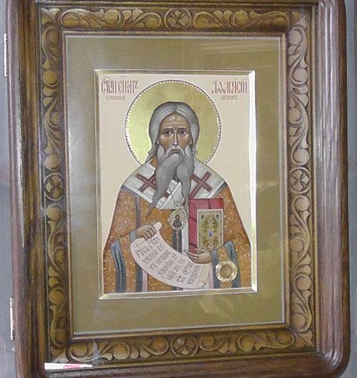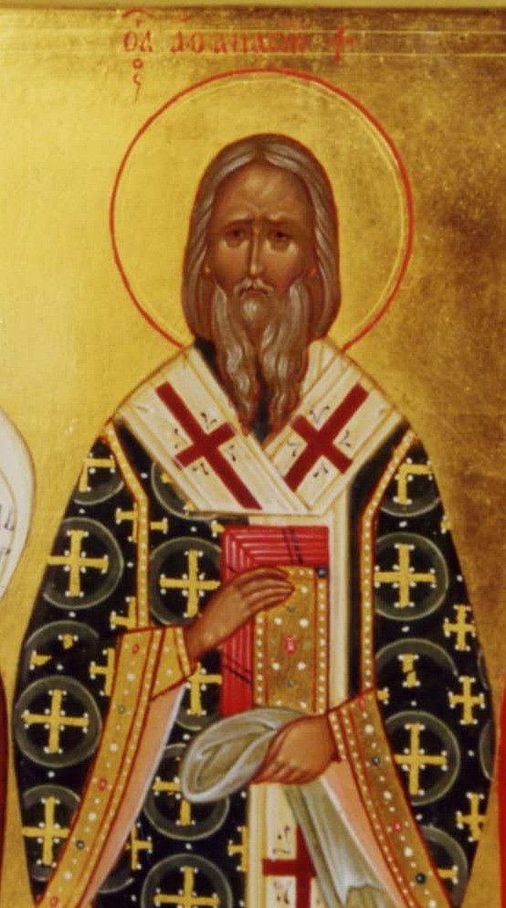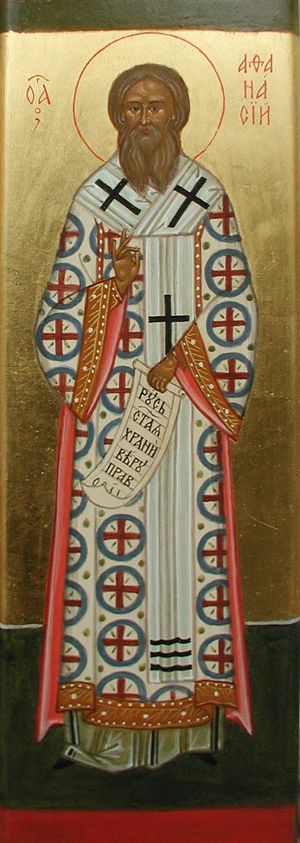 Сла́вы Бо́жия ревни́теля/ и благоле́пия церко́внаго блюсти́теля,/ те́сным житие́м и мно́гими по́двиги/ вели́кому иера́рху Александри́йскому подо́бника,/ святи́теля Афана́сия, испове́дника Росси́йскаго,/ усе́рдно восхва́лим, ве́рнии./ Сей бо при́сно мо́лится/ о спасе́нии земна́го Оте́чества своего́/ и о всех, живу́щих в нем,/ велегла́сно с любо́вию взыва́я:/ Русь Свята́я,/ храни́ ве́ру правосла́вную,// в не́йже тебе́ утвержде́ние.