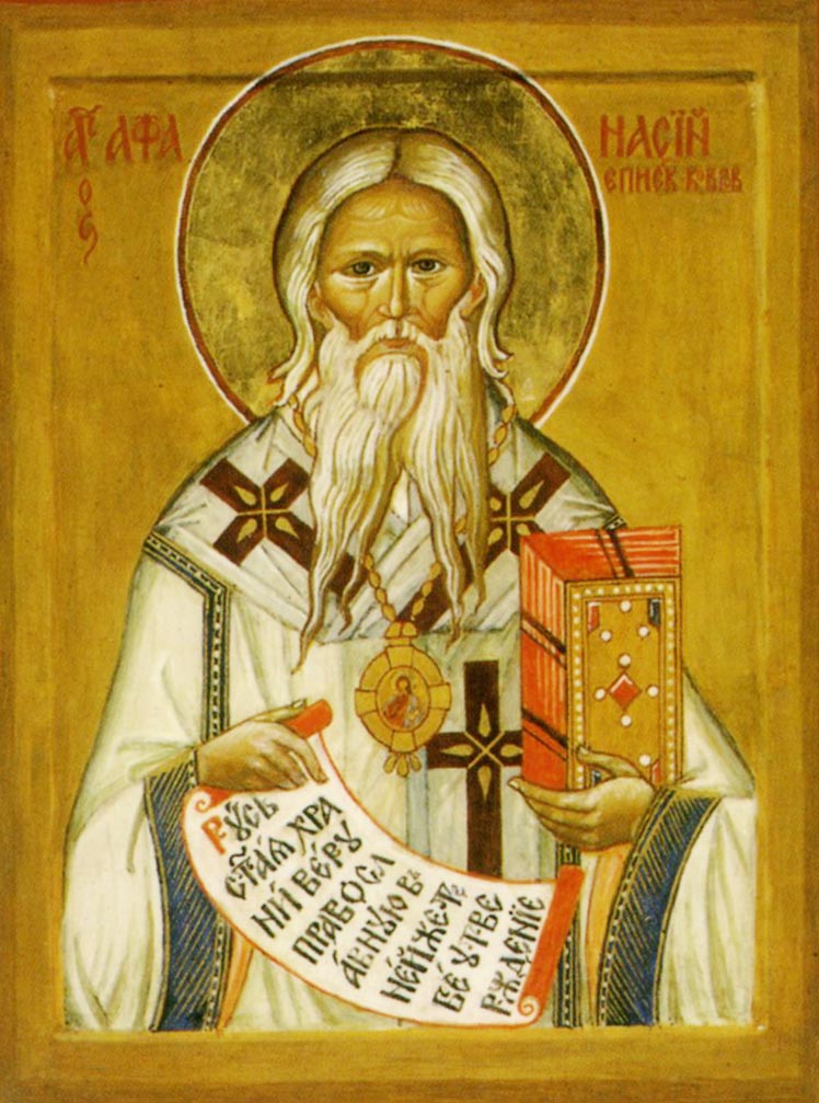 Днесь Афана́сий святи́тель,/ Христо́в испове́дник и пра́ведник,/ в невече́рнем Ца́рстве Сла́вы/ све́тло лику́ет/ и в со́нме всех Ру́сских святы́х/ всесоста́вным гла́сом/ побе́дную песнь воспева́я,/ приле́жно мо́лит о нас // Преве́чнаго Триеди́наго Бо́га.
