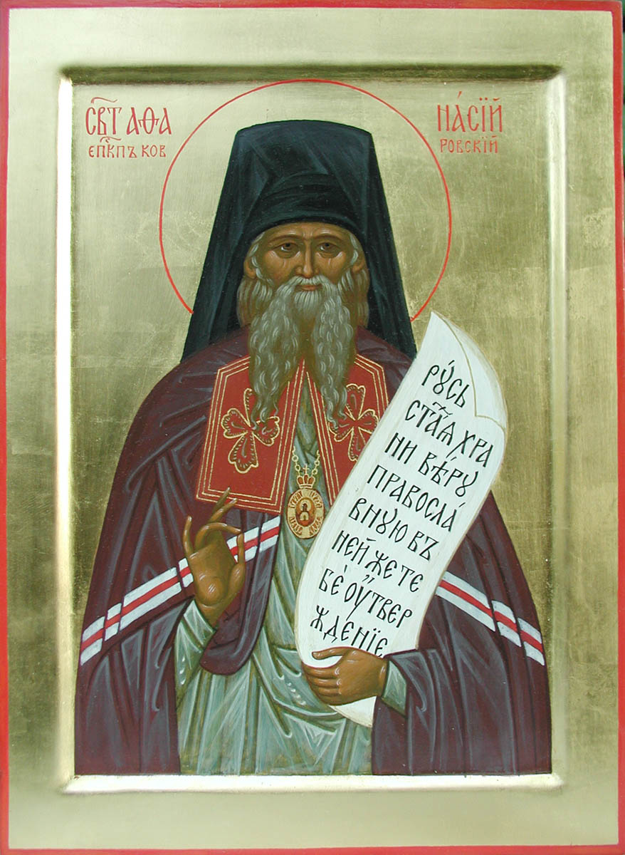 О, многострада́льне и благоглаго́ливе святи́телю и испове́дниче Христо́в Афана́сие, па́стырю до́брый па́житей Це́ркве Ру́сския, Правосла́вия ревни́телю, покая́ния пропове́дниче, моли́твы сто́лпе, любве́ неиссяка́емый исто́чниче, цевни́це богодухнове́нная! Ты, земле́ю дре́внею и свято́ю воспита́нный, измла́да сосу́д избра́нный Бо́гу яви́лся еси́, ре́вностно служа́ Ему́ словесы́ и де́лы, моли́твою те́плою, посто́м неосла́бным, ми́лостынею нелицеме́рной. Слу́жбе Бо́жией зело́ прилежа́, тала́нт песнотво́рчества усе́рдно умно́жил еси́ и мно́гими духоно́сными пе́нии Це́рковь Ру́сскую украси́л еси́, наипа́че же потруди́лся в прославле́нии святы́х земли́ Ру́сския, и́хже пред кончи́ною ку́пно с Го́сподом зре́ти сподо́бился еси́. И́стины ра́ди и кро́тости и пра́вды досто́йно пома́за тя во святи́тели Влади́мирския благода́ть Свята́го Ду́ха, е́юже просвеще́н, пропове́дал еси́ Правосла́вия преда́ния неукло́нно посреде́ безбо́жных гони́телей. А́ще и в заточе́ниих, изгна́ниях и го́рьких рабо́тах три́дцать лет пробы́л еси́, поноше́ния, озлобле́ния и ра́ны за Христа́ сла́дце претерпева́я, ты, свяще́нное испове́дание я́ко забра́ло восприи́м, богоху́льные дерзнове́нно обличи́л еси́ и безпло́тные враги́ посрами́л еси́, па́ству свою́ де́лы па́че слов поуча́я, я́ко Бо́гу подоба́ет повинова́тися па́че челове́к. Те́мже блаже́нства изгна́нных пра́вды ра́ди сподо́бився и Престо́лу Небе́сному предстоя́, моли́ Всеблага́го Бо́га на́шего, да утверди́т Це́рковь Ру́сскую, ея́ па́стырей непозы́блемы в и́стинах ве́ры, от ересе́й и раско́лов, да пребу́дут ча́да ея́ тве́рды во испове́дании свята́го Правосла́вия, претерпева́я все напа́сти вре́мени, прославля́я еди́ным се́рдцем и еди́ными усты́ ди́вного во святы́х Свои́х Бо́га, Отца́ и Сы́на и Свята́го Ду́ха, во ве́ки веко́в. Ами́нь.