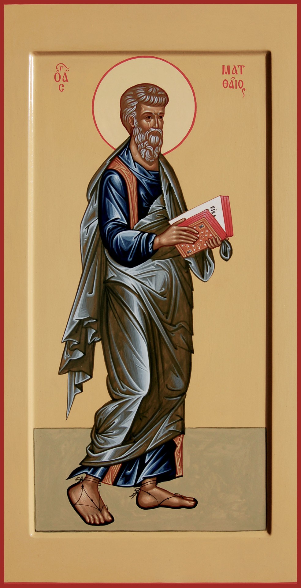Был апостолом из двенадцати. До обращения ко Христу Матфей служил мытарем, сборщиком податей для Рима. Услышав глас Иисуса Христа: «Иди за Мной» (Мф.9.9), он оставил свою должность и пошел за Спасителем. Восприняв благодатные дары Духа Святого, апостол Матфей вначале проповедовал в Палестине. Перед уходом на проповедь в дальние страны по просьбе иудеев, остававшихся в Иерусалиме, апостол написал Евангелие. В ряду книг Нового Завета Евангелие от Матфея стоит первым. Написано на еврейском языке. Речи и деяния Спасителя Матфей излагает в соответствии трем сторонам служения Христа: как Пророка и Законодателя, Царя над миром невидимым и видимым и Первосвященника, Приносящего Жертву за грехи всех людей.