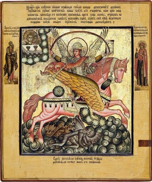 Ви́дяще твое́ проти́ву по́лчищ сатани́нских дерзнове́ние, вси чи́нове а́нгельстии с ра́достию подвиго́шася во след тебе́ на брань за и́мя и сла́ву своего́ Влады́ки, вопию́ще: кто я́ко Бог? Мы же, ве́дуще сатану́ под нога́ма твои́ма пове́ржена, тебе́, я́ко победи́телю, зове́м:
