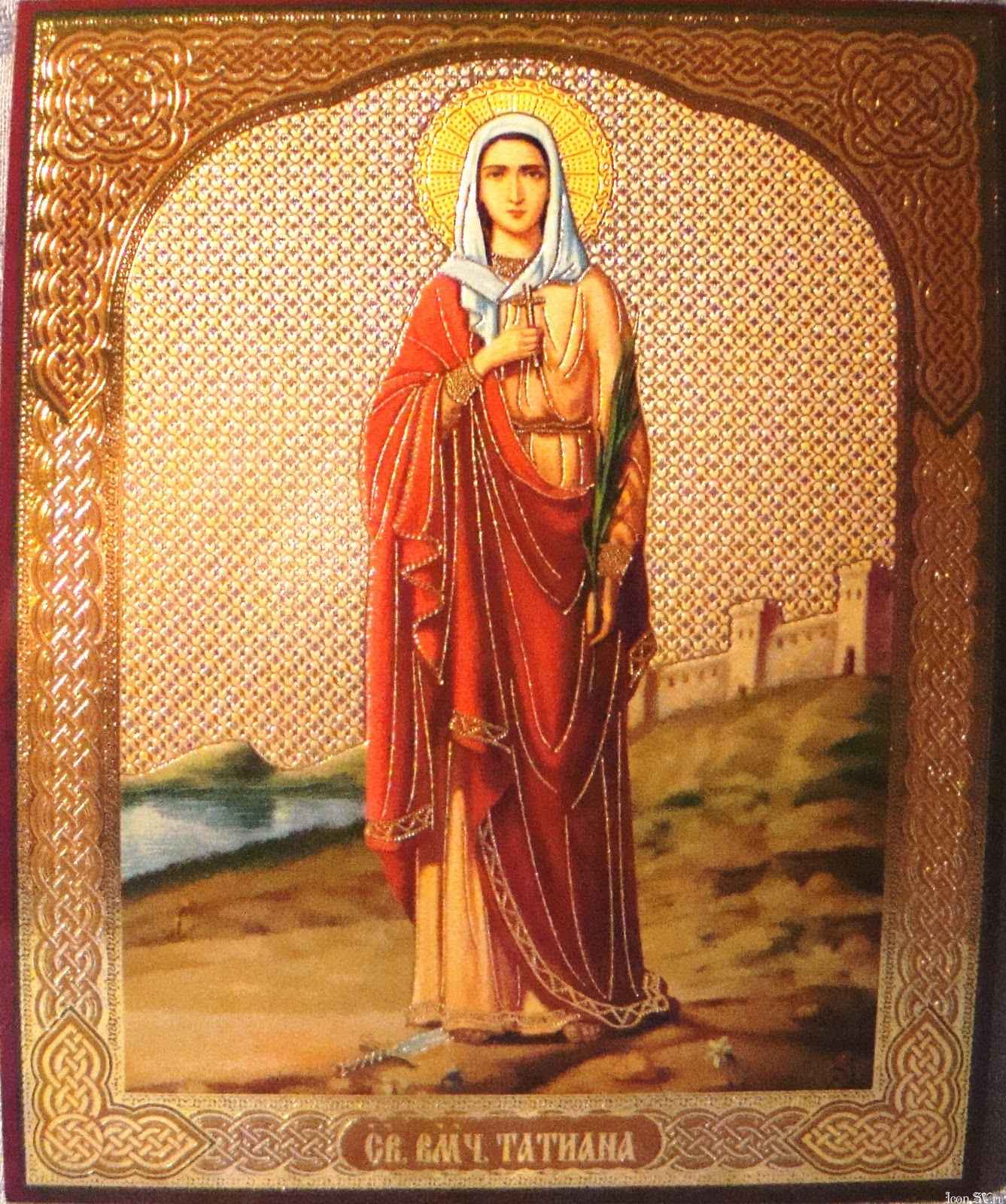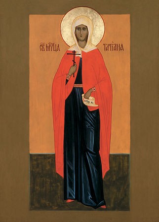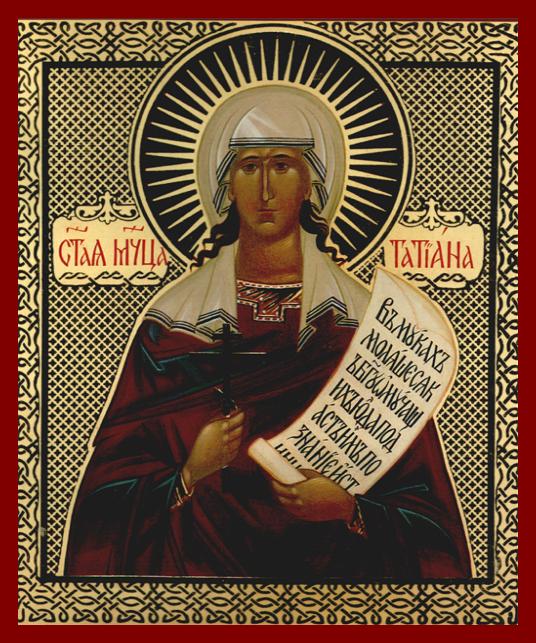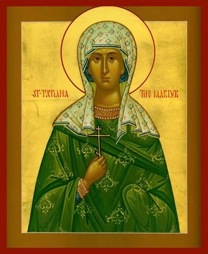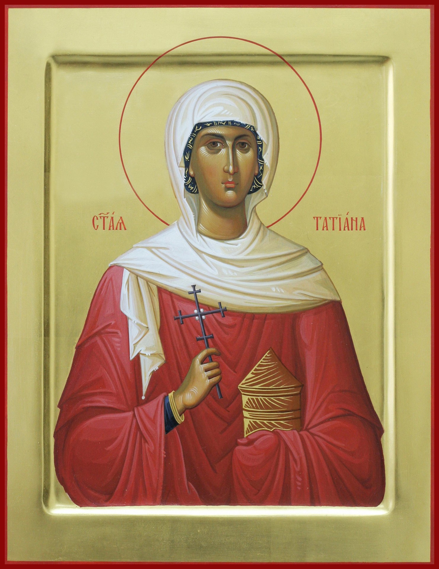 Святая Татиана была дочерью богатого римлянина и была воспитана им в христианской вере. Когда Татиана достигла совершеннолетия, она стала равнодушна к богатству и иным благам и возлюбила всем сердцем духовный образ жизни. Она навсегда отказалась от супружеской жизни и за добродетельную жизнь была назначена диакониссой Римской церкви. В этой должности она с усердием ухаживала за больными, посещала темницы, помогала неимущим, стараясь постоянно угодить Богу молитвами и добрыми делами.