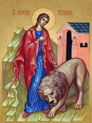 При императоре Александре Севере (222–235 гг.) святая Татиана за исповедание Иисуса Христа приняла мученическое страдание от римского градоправителя Ульпиана (около 225 г.) Согласно древнему рассказу, святую Татиану после разных истязаний бросили на арену цирка (Колизея), чтобы свирепый лев растерзал ее для забавы зрителей. Но вместо этого лев стал кротко ласкаться к ней. Тогда святую Татиану усекли мечом. Восемь слуг градоправителя, мучивших святую, уверовали в Иисуса Христа, видя над ней силу Божию, – и они тоже были после мук усечены мечом.