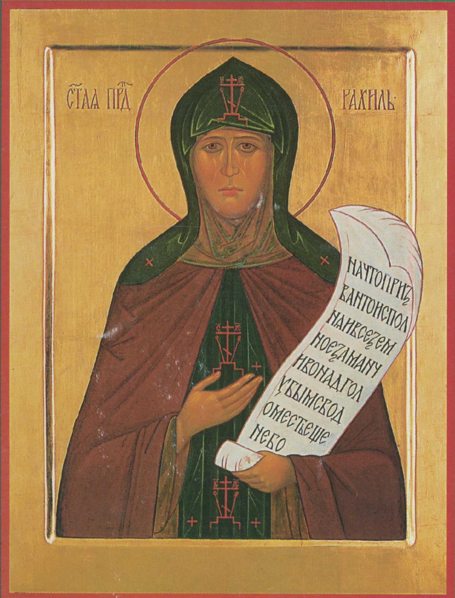 Яко маслина многоплодна возросла еси во обители Бородинстей, и процветши да-ровании исцелений и чудес, преподобная мати Рахиле, плод сторичный принесла еси, повелением Богородицы всеусердно ближнему послуживши, кротостию и лю-бовию многих на путь спасения наставляющи и добродетели научающи, тем же светлым тя венцем увенча подвигоположник Христос Бог наш, Его же моли спасти и просветити души наша.