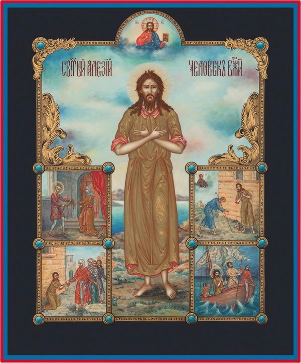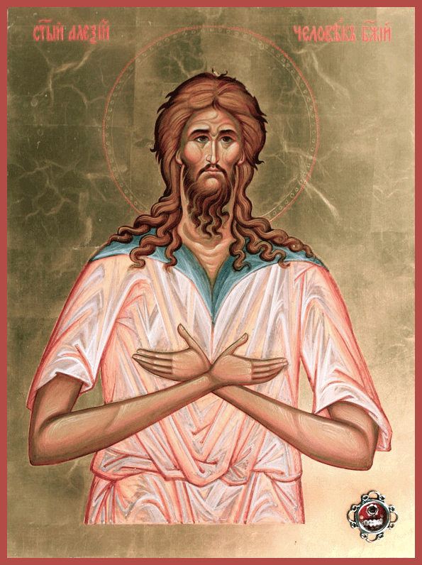 Преподобный Алексий, человек Божий, родился в Риме от знатных и благочестивых родителей. Отец его Евфимиан был сенатором. Он отличался душевной добротой, был милосерден к больным и страждущим, ежедневно устраивал у себя дома три стола: для сирот и вдов, для путников и для нищих. У Евфимиана и жены его Аглаиды долго не было детей, и это омрачало их счастье. Но благочестивая Аглаида не оставляла надежды – и услышал ее Бог, и послал им сына. Отец назвал младенца Алексий (в переводе с греческого «защитник»). Святой Алексий рос здоровым ребенком, хорошо и прилежно учился. Когда же он достиг совершеннолетия, Евфимиан и Аглаида решили его женить. Они выбрали для сына девушку царской крови, очень красивую и богатую. Оставшись после свадьбы наедине с молодой женой, святой Алексий отдал ей свой золотой перстень и поясную пряжку со словами: «Сохрани это, и да будет между тобой и мной Господь, доколе не обновит нас Своею благодатью». Потом он вышел из брачного покоя и той же ночью покинул отчий дом. Сев на корабль, отплывающий на Восток, юноша прибыл в Лаодикию Сирийскую. Здесь он пристал к погонщикам ослов и добрался с ними до города Эдессы, где хранился Нерукотворный образ Господа, запечатленный на плащанице. Раздав остатки имущества, юноша оделся в лохмотья и стал просить милостыню в притворе храма Пресвятой Богородицы. Каждое воскресенье приобщался он Святых Христовых Тайн. По ночам Алексий бодрствовал и молился. Вкушал он только хлеб и воду.