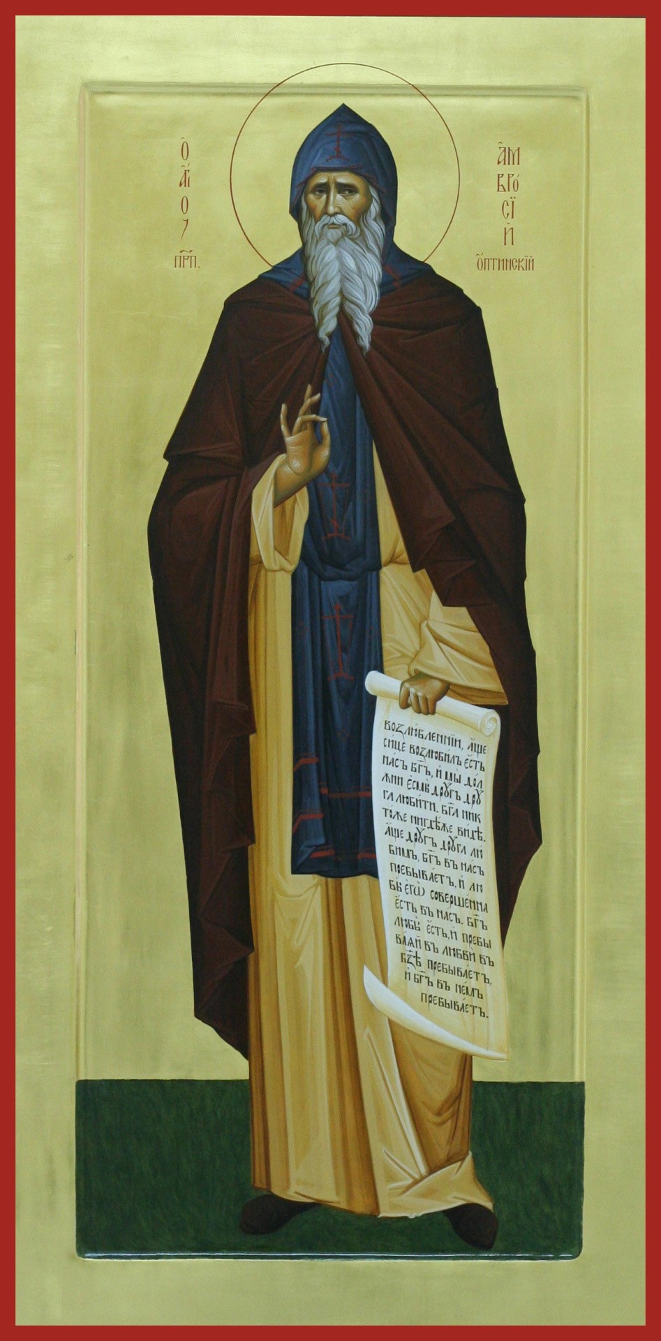 Со слезами припадем благоговейно к образу божественному Амвросия чуднаго, просяще вси о дарованиих многоразличных душу ко спасению присно устремляющаго.