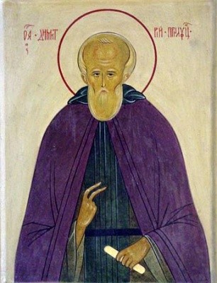 Свыше от Бога, преподобне,/ благодать приял еси духовную,/ и от Него убо познался еси, блаженне,/ того ради и ты духом познал еси лучшая Его,/ будущаго века пребывание,/ и постнически испытався во своих обителех./ И ныне со ангели ликовствуя,/ Спасу всех за ны молися, святе Димитрие, да вси вопием:/ Слава Давшему ти крепость,/ слава Венчавшему тя,/ слава Действующему тобою всем исцеления.Кондак, глас 8