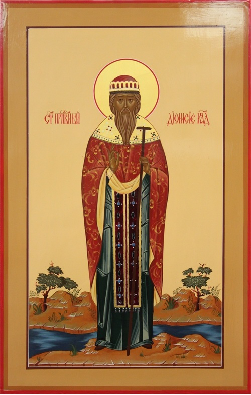 Преподобный Дионисий Радонежский родился в г. Ржеве Тверской губернии. Во Святом Крещении ему было наречено имя Давид. В Кашинском уезде Тверской губернии есть село Зобнино; вероятно, родители преподобного Феодор и Иулиания происходили из этого села, от названия которого и получили свою фамилию – Зобниновские. Еще во дни детства Давида родители переселились в соседний город Старицу, где отец принял старейшинство над ямской слободой. Иноки обители Старицкой Гурий и Герман, научившие грамоте отрока, рассказывали о добродетельном житии его. С юных лет отличался он добротой, кротостью и любовью к чтению священных книг, имел смирение и простоту сердечную свыше обычая человеческого. Пренебрегая детскими играми, в страхе Божием прилежно внимал учению и соблюдал в сердце своем ревность к добродетелям. Его духовный отец, по имени Григорий, дивился его смирению и крепкому разуму, ибо внутренними очами прозрел имеющую в нем быть благодать Святаго Духа и не раз говорил своим духовным детям: «Посмотрите, чада, на сего сына моего по духу, который и сам будет огнем духовным для многих».