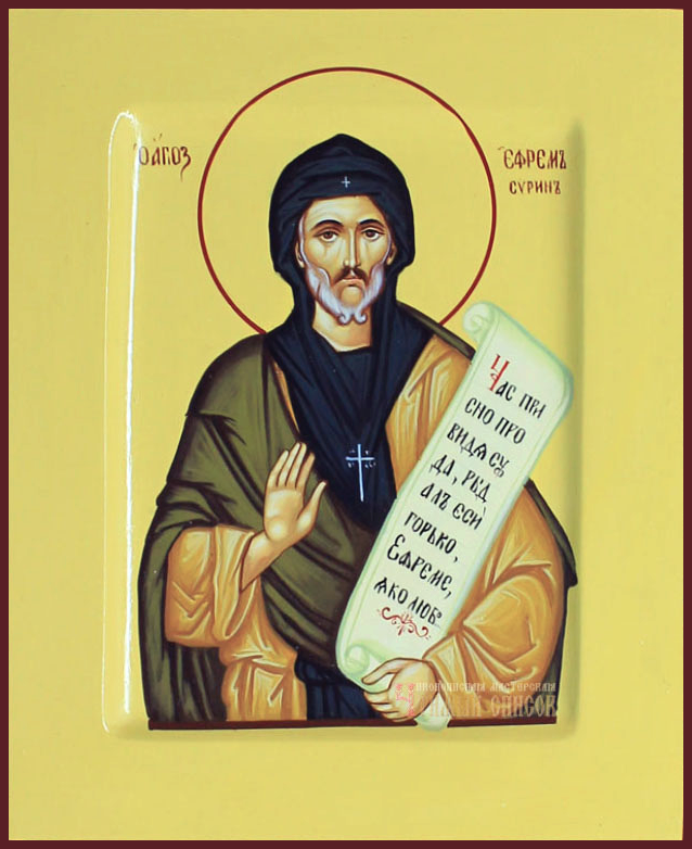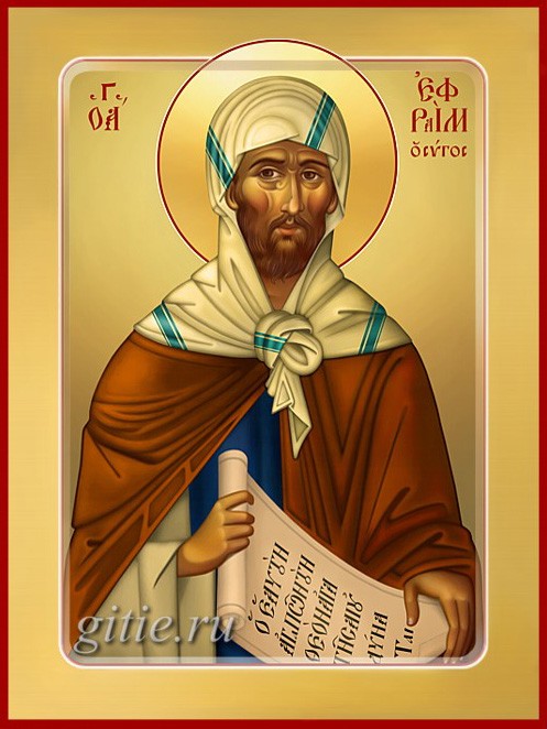тропарь, глас 8. Слезами твоих источников пустыни безъчадное напоил еси и, еже из глубины, воздыхании во сто труды уплодоносил еси - и бысть светильник вселенней, сияя чудесы, Ефреме-отче наш, моли Христа-Бога спастися душам нашим. Слава, и ныне. Иже нас ради Рождеи Ся от Девы и распятие претерпев, Благии, Испровергии смертию смерть и восресение Явлеи яко Бог - не презри, их же созда рукою Своею, - яви человеколюбие Свое, Милостиве, - приими рождьшую Тя - Богородицу, Молящуюся за нас, - и спаси, Спасе наш, люди согрешьшыя.Канон, поем в глас 6. Песнь 1, ирмос: Яко по суху ходив израиль по бездне стопами, гонителя фараона видя потопляема - Богу победную песнь поем, вопияше.ЗАПЕВ. Преподобне отче Ефреме, моли Бога о нас. Евъфратъским одождением - твоими молитвами душю мою напой, изъсохшую зноем страстей. И слово ми вдохни, твой восхваляющу праздник, преблаженне.ЗАПЕВ. Свет мысленыи облистал еси - светло явился еси солнце: добродетельми светолучными и учении добротами, Ефреме, озаряя верных все исполнение.СЛАВА. Струями слез пламень страстей погасив, был еси сосуд честен, Ефреме, Святаго Духа - источник источая учением, Богоблаженне.И НЫНЕ. Нетленно Слово во утробе приимши, родила еси - Избавляющаго от тли Тому служащыя присно, Мати-Дево, Чистая, Двери - воистину - Живота.Песнь 3, ирмос: Несть Свята, якоже Ты, Господи, Боже мой, - Вознесыи рог верных Си, Блаже, и Утвердивыи их на камени исповедания Ти.ЗАПЕВ. Тины всякия страстныя себе очищь - явил ся еси приятилище добродетелем, воистину, и сосуд въмещен дарованиям Святаго Духа.ЗАПЕВ. Никакоже сна очима подав - храм явил ся еси Святей Троице и Премудрости сокровище, мир обогащая златозарными учении, блаженне.СЛАВА. Познавает другии Ефрат Христова честная Церкви: златыми течении напояюща мудрых учения водами - и тварь всю напояюща.И НЫНЕ. Во двою естеству - единыи от Святыя Троицы - от чистых Твоих кровий воплощь Ся, Боголепно пройде, яже от Адама спасая благостию, О, Пречистая.седален, глас 5. Сокровище Премудрости тайнам Христовем, чашю Божественаго умиления - воспоем вернии в памяти его: тезоименно бо всегда сердца верных веселит утешении Божествеными Ефрем, яко делатель и таиник Господним откровением. Слава, и ныне. Богородичен: Теплая Предстательнице, и Непобедимая, Упование известное и непостыдное, Стено и Покрове, и Пристанище притекающим Ти, присно Дево, Чистая, - Сына Своего и Бога моли со Ангелы Мир даровати мiрови и спасение и велию милость. Кресто-Богородичный: Крестом Сына Твоего, Богоблагодатная, идольская лесть вся упразднися и бесовъская крепость попрана бысть, сего ради вернии подолгу Тя присно поем и благословим и, Богородицу - воистину! - исповедающе, величаем.Песнь 4, ирмос. Христос мне - Сила, Бог и Господь - честная Церкви Боголепно зовет, вопиющи от совести чисты, о Господе празднующи.ЗАПЕВ. Сила глаголом твоим протече весь мир, высоко творя сиянием смирения, отгоня ослепление душам, блаженне.ЗАПЕВ. Непорочно прошел еси житие, слезами себе омывая - и Судии всех Пришествие написуя словесы мудрыми, Богоявленне, досточюдне.ЗАПЕВ. Видев твоего смирения преславную высоту Господь - дарует тебе слово высокотворно, имже ересем лютая возношения смиришася.СЛАВА. Укрепль себя благодатию Вседержителя - ополчи себя къ началом бесовъским, отче, - и победил еси, о нас моляся тепле, восхваляющих тя.И НЫНЕ. Яко Боже