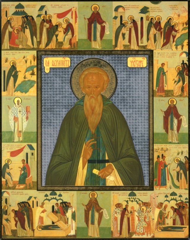 Далече зело слышано бысть богоугодное житие твое, преподобне. И от конец земли Русския притекоша к тебе любящии безмолвие. Ты же сих приемляй с любовию, яко отец о обращении заблуждших чад радовался еси. Темже и мы вопием ти: