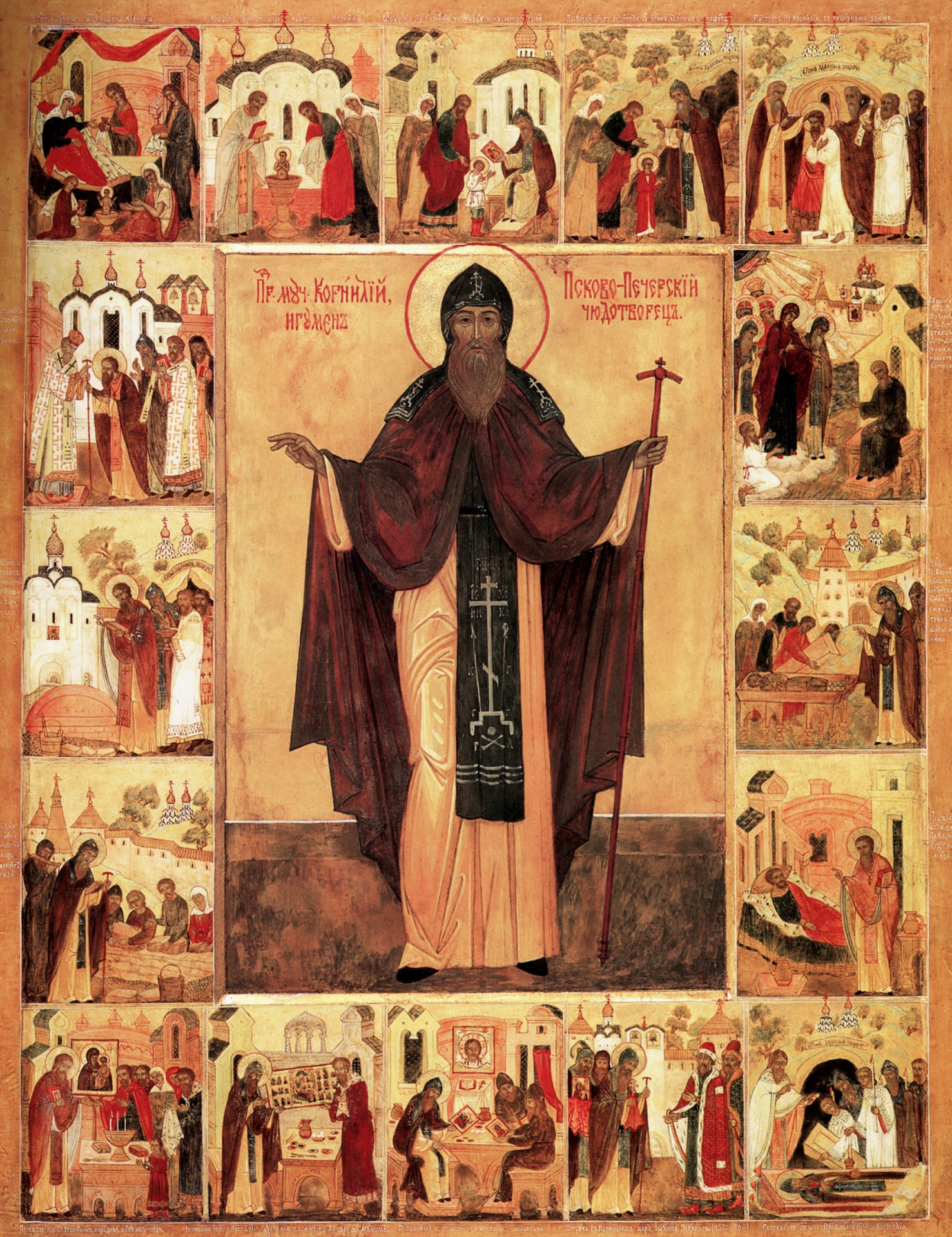 Преподобномученик Корнилий Псково-Печерский (1501–1570) родился в Пскове в боярской семье. Родители его, Стефан и Мария, воспитывали сына в благочестии и страхе Божием. Уже в раннем возрасте мать заметила у отрока Корнилия особенную склонность к духовной жизни, научила его молитве и привила любовь к странникам. Чтобы дать сыну образование, родители отдали его в Псковский Мирожский монастырь. В монастырских стенах отроков воспитывали в послушании, обучали чтению и письму, искусству книгописания и писанию икон. В монастыре составлялись и переписывались летописи, жития святых, богослужебные книги. В Мирожской обители юный Корнилий подвизается под началом старца, совершая подвиги молитвы и труда, делал свечи. С особенным тщанием приготовлялся он к писанию икон, соблюдая перед этим пост, молился Пресвятой Владычице о благословении его на труд. Во время работы над иконой хранил собственную чистоту, творя в душе непрестанную молитву.