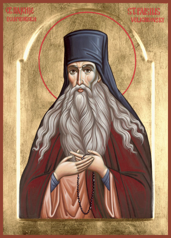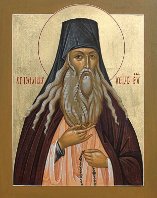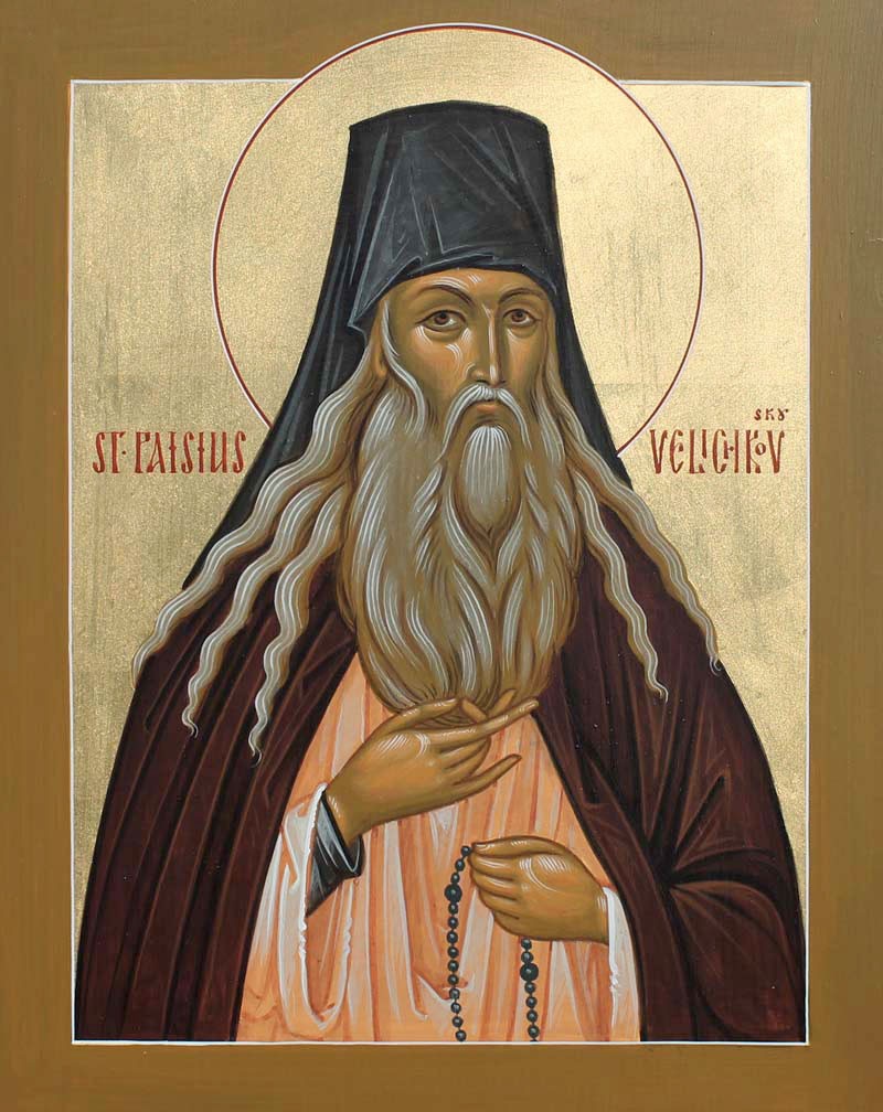 О, великий наставниче, ревнителю и учителю премудрый всех чающих спасения и подвига духовнаго, преподобне отче наш Паисие! Услыши нас, грешных, тебе верою и любовию призывающих, и вонми прошением нашим. Ты от юности любве ради Божия оставил еси отечество твое и в иных странах безмолвия ища, во Святей Горе Афонстей и обителех иноческих Молдовлахии небесное богатство стяжал еси. Ты великим воздержанием, в трудех, теснотах и крайнем лишении плоть твою духови покорив, стяжал еси сокрушение сердечное, трезвение, истинное безстрастие, молитву сердечную и сим обновитель древняго иночества и столп Православия показался еси; темже десница Божия учителя, наставника и чадолюбиваго отца возведе тя и благоволи собрати священный вертоград ученик твоих, иже простре отрасли своя во вся концы Российския земли.