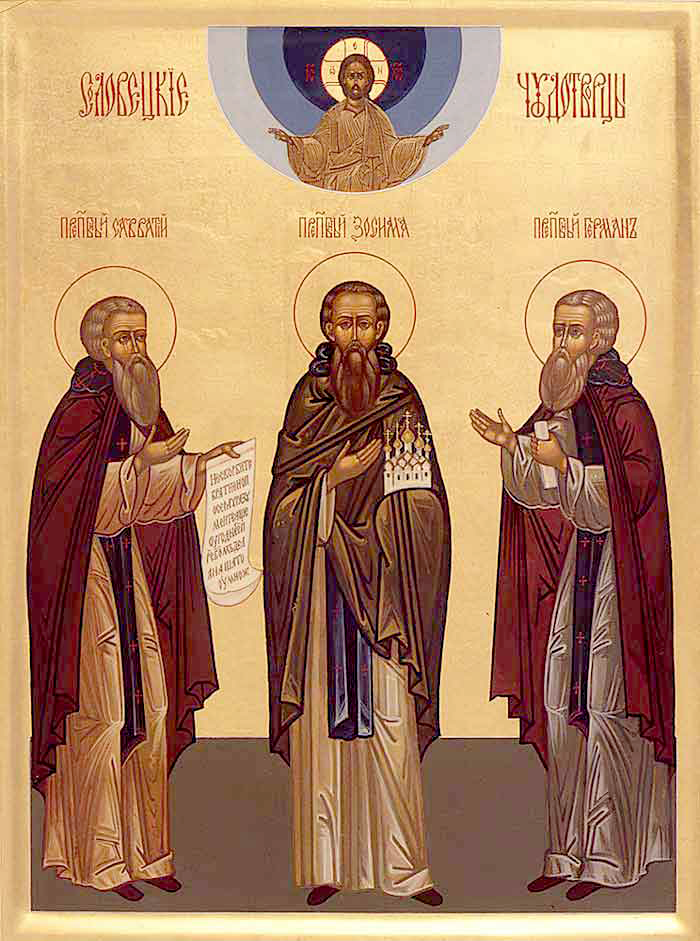Избраннии угодницы Господни и велицыи чудотворцы, светильницы Христовы Церкве пресветлии, облиставшии благочестия светлостьми пустыни Севернаго Помория, и всей стране Российстей сияющии выну чудес множеством, Преподобнии отцы наши Зосимо, Савватие и Германе, яко имущии дерзновение ко Господу, благоприятными своими к Тому мольбами от всяких нас бед и зол сохраняйте, да радующеся зовем вам: