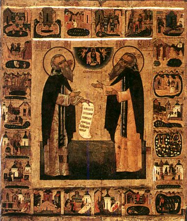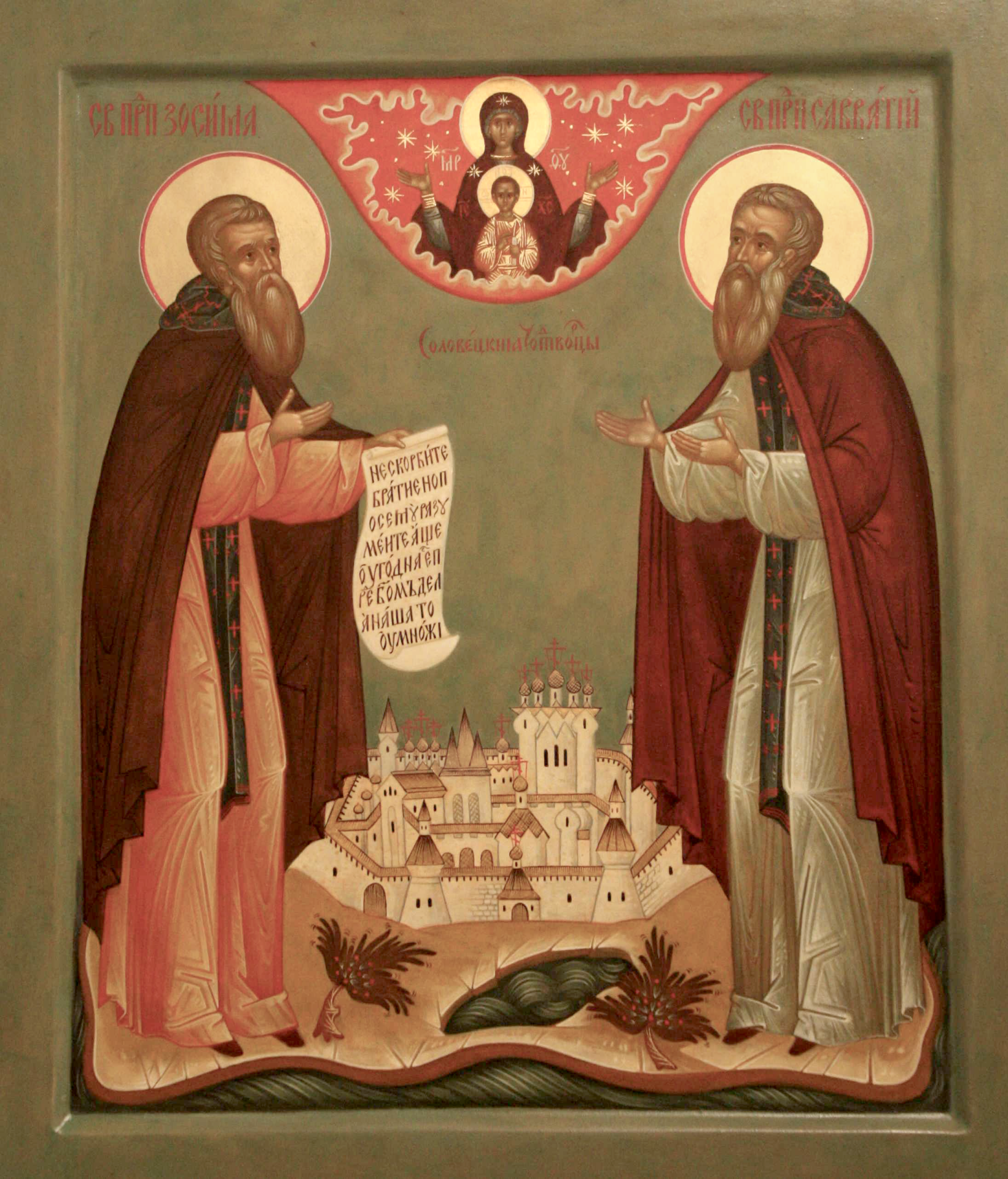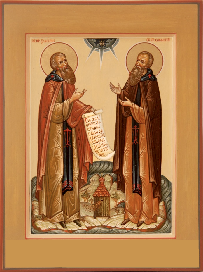 Христовою любовию уязвившеся, преподобнии, и Того крест на рамо вземше понесли есте, божественне вооружившеся на невидимыя враги, и непрестанныя молитвы яко копие в руках имуще, крепко победили есте бесовская ополчения: благодать Господню приемше целити недуги душ и телес, притекающих к ракам честных мощей ваших, чудес лучи испущаете всюду. Тем зовем вам: радуйтеся, преподобнии отцы Зосимо и Савватие, монахом удобрение.ИкосКто доволен изрещи ваших чудодеяний, преподобнии отцы Зосимо и Савватие, мы убо радостию и Божественною любовию почитающе всехвальную и всечестную память вашу, малое сие пение приносим: радуйтеся, исполненнии Христовы красоты, и пресветла от Него и преизобильна восприимшии воздаяния: телесы убо вас морский остров прият, души же самое небо, почести трудов своих, прехвальнии, восприемше от Христа всех Царя и Бога. Тем молим вы, посещайте милостивно, и молите непрестанно о всех нас.
