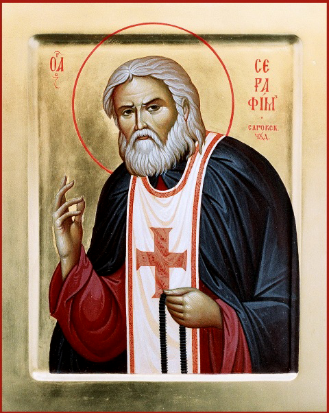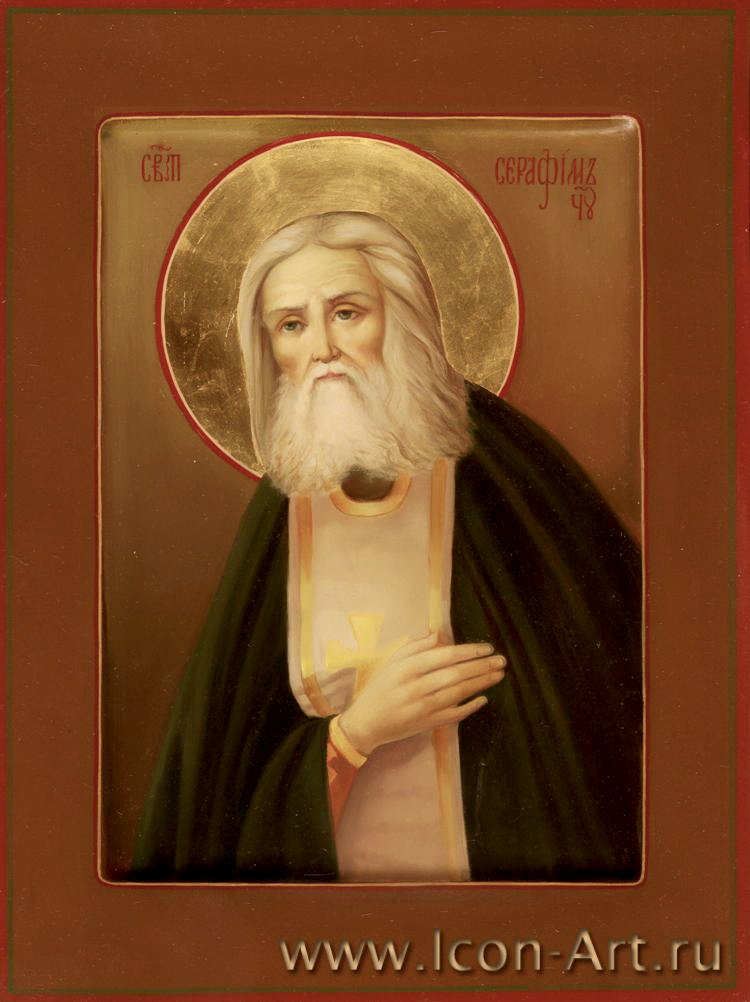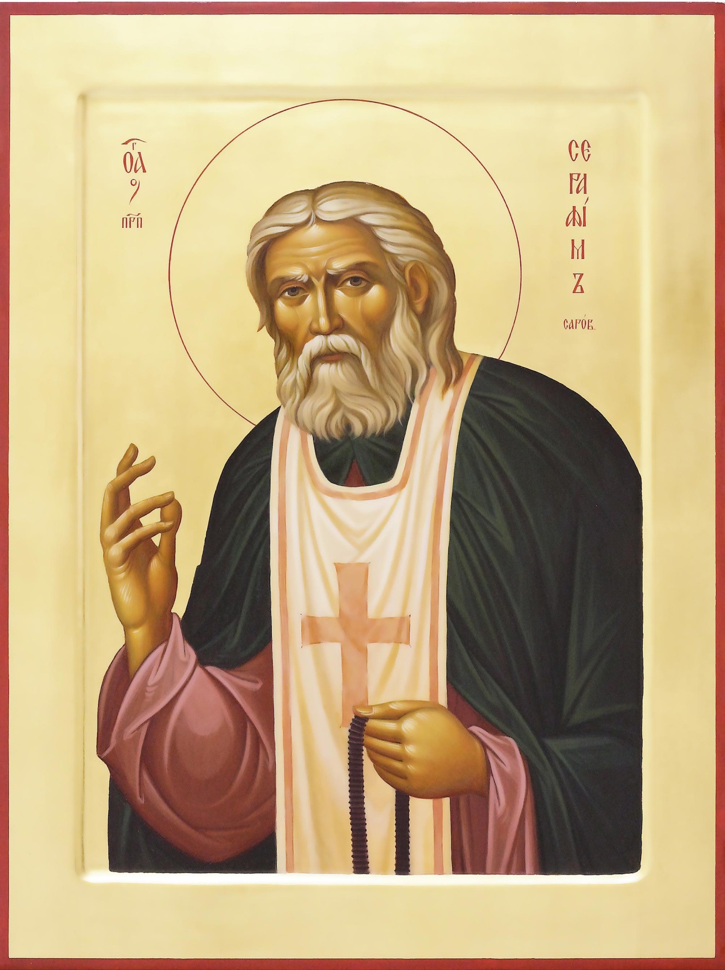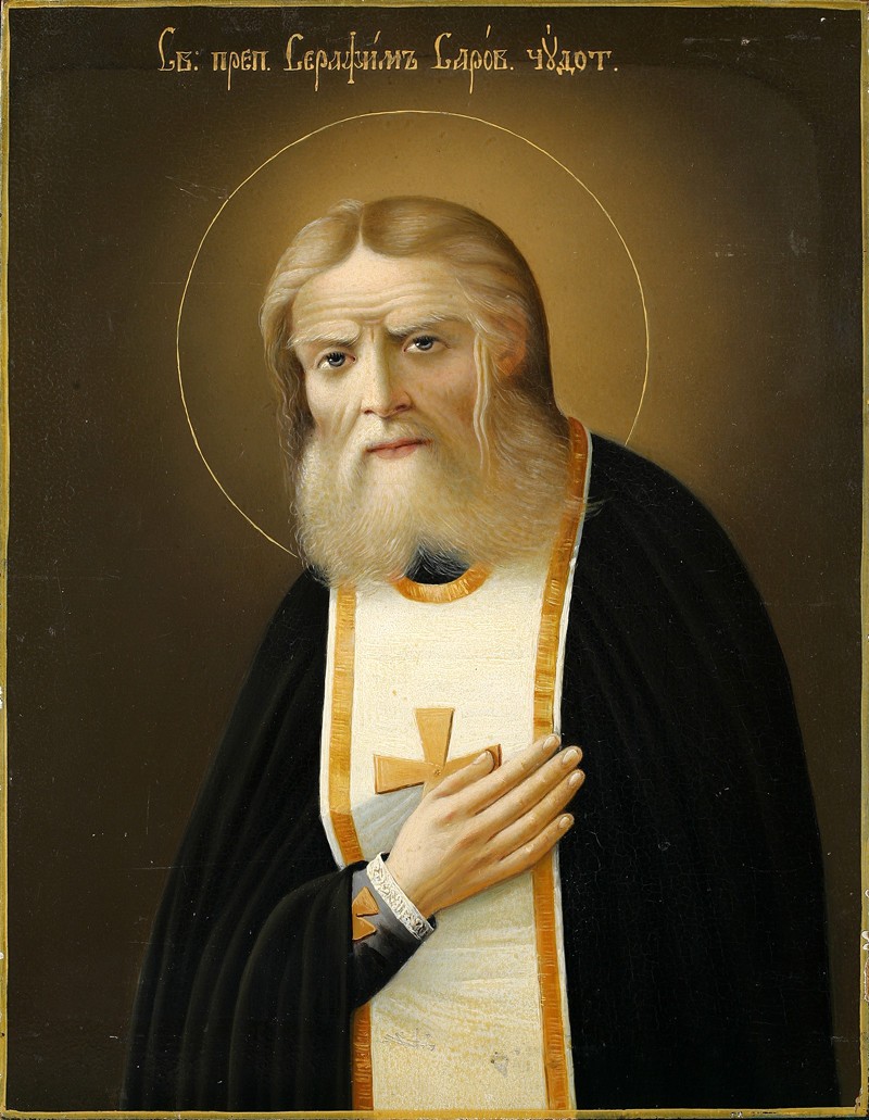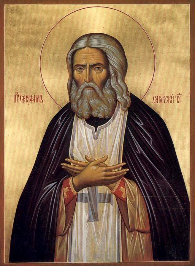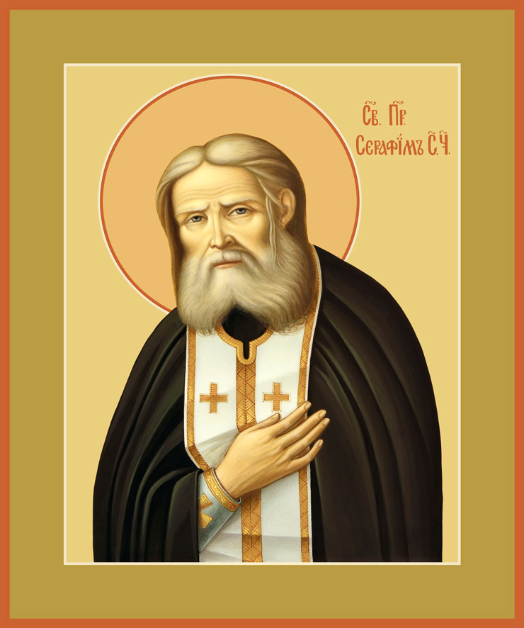 О пречудный отче Серафиме, великий Саровский чудотворче, всем прибегающим к тебе скоропослушный помощниче! Во дни земнаго жития твоего никтоже от тебе тощ и неутешен отыде, но всем в сладость бысть видение лика твоего и благоуветливый глас словес твоих. К сим же и дар исцелений, дар прозрения, дар немощных душ врачевания обилен в тебе явися. Егда же призва тя Бог от земных трудов к небесному упокоению, николиже любы твоя преста от нас, и невозможно есть исчислити чудеса твоя, умножившаяся, яко звезды небесныя: се бо по всем концем земли нашея людем Божиим являешися и даруеши им исцеления. Тем же и мы вопием ти: о претихий и кроткий угодниче Божий, дерзновенный к Нему молитвенниче, николиже призывающия тя отреваяй! Вознеси о нас благомощную твою молитву ко Господу сил, да дарует нам вся благопотребная в жизни сей и вся к душевному спасению полезная, да оградит нас от падений греховных и истинному покаянию да научит нас, во еже беспреткновенно внити нам в вечное Небесное Царство, идеже ты ныне в незаходимей сияеши славе, и тамо воспевати со всеми святыми Живоначальную Троицу во веки веков. Аминь.