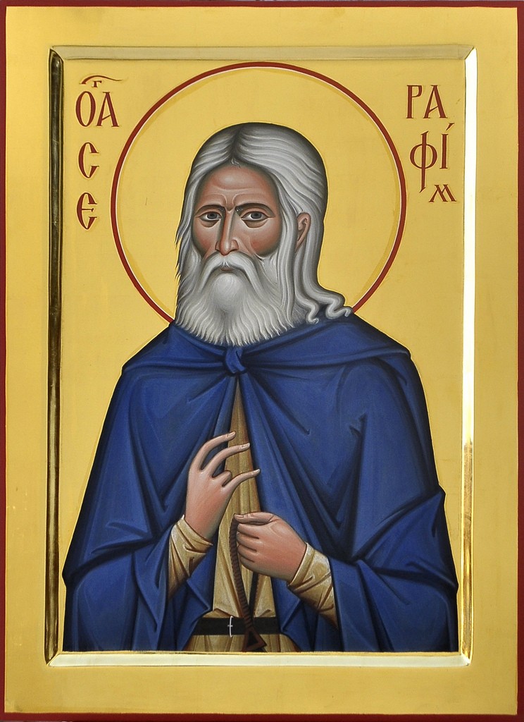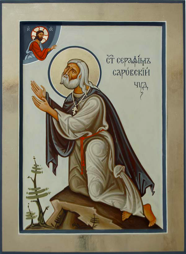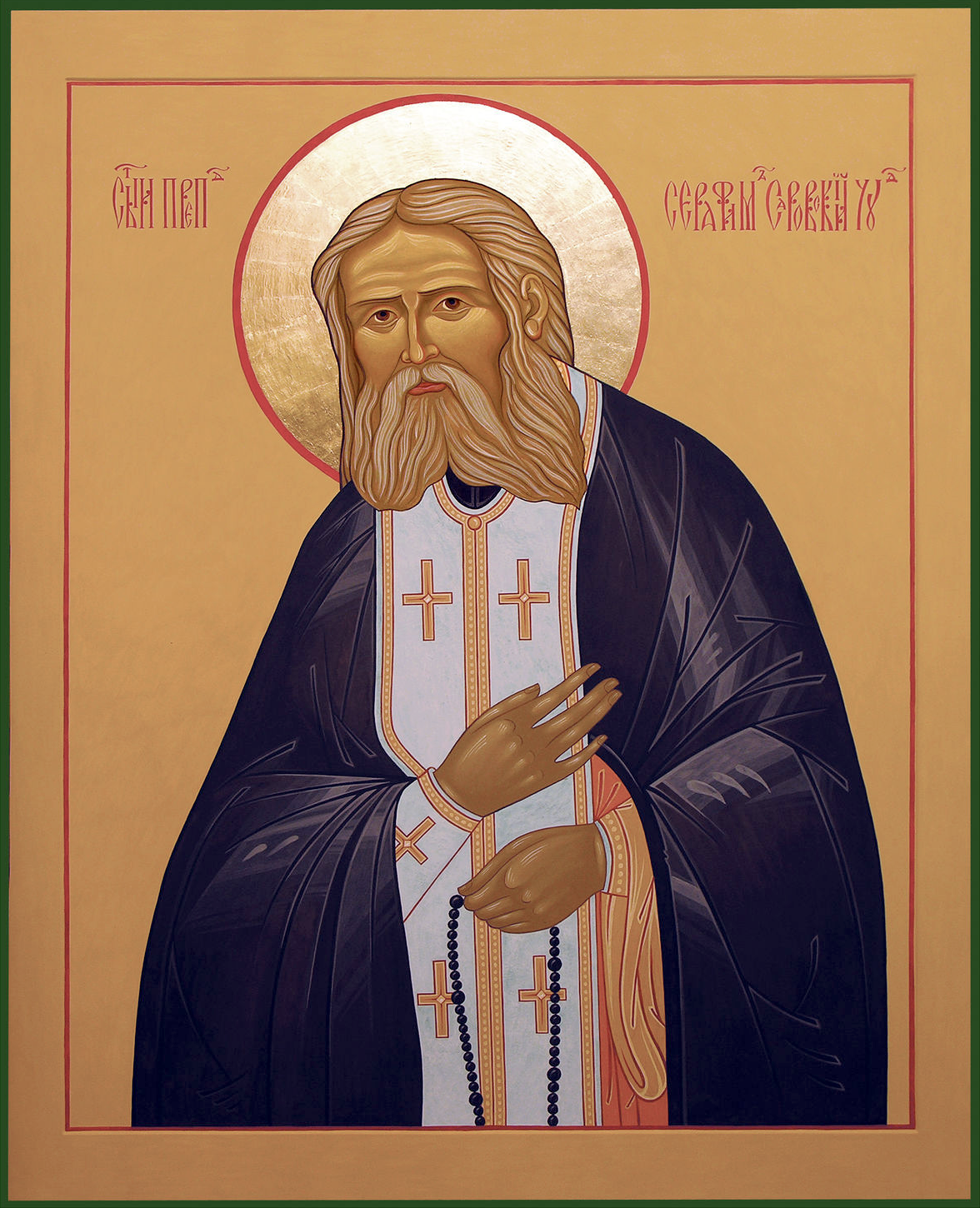 Великия твоя пустынныя подвиги и труды и сладость учения твоего почитаем, преподобне Серафиме, имиже многия приходящия к тебе просветил еси и научил еси воспевати Единосущную Троицу.