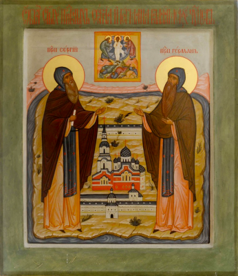 От мирския молвы бегающе, безмолвия и благочестия рачители,/ в тихое пристанище Валаама от востока приидосте,/и в нем Евангельски Христу добродетельми последовавше, на верх совершенства востекли есте:/и ныне в торжестве премирном Богозрением наслаждающиеся,/ всеблаженнии отцы Сергие и Германе, Человеколюбца Бога молите,/ еже спасти всех нас, благочестно вас почитающих.