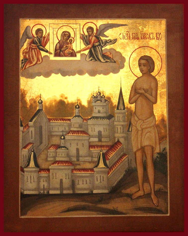 Стеною молитв твоих, угодниче Христов, огради нас от всякаго душевреднаго искушения диавольскаго, яко тебе дарова нам Преблагий Бог покров и защиту душам и телесем нашым. Тебе убо прославляем и просим: помози нам во всяцей скорби и обстоянии, сице тебе вопиющым: Радуйся, Церкве торжествующия на небеси изрядное украшение. Радуйся, Церкве воинствующия на земли крепкое вспоможение. Радуйся, целомудрия и чистоты зерцало светлейшее. Радуйся, кротости и нищеты духовныя образе совершеннейший. Радуйся, смирения любителю. Радуйся, в жизни и по смерти образ смиренномудрия показавый. Радуйся, Иакове праведный, чудотворче Христов предивный.