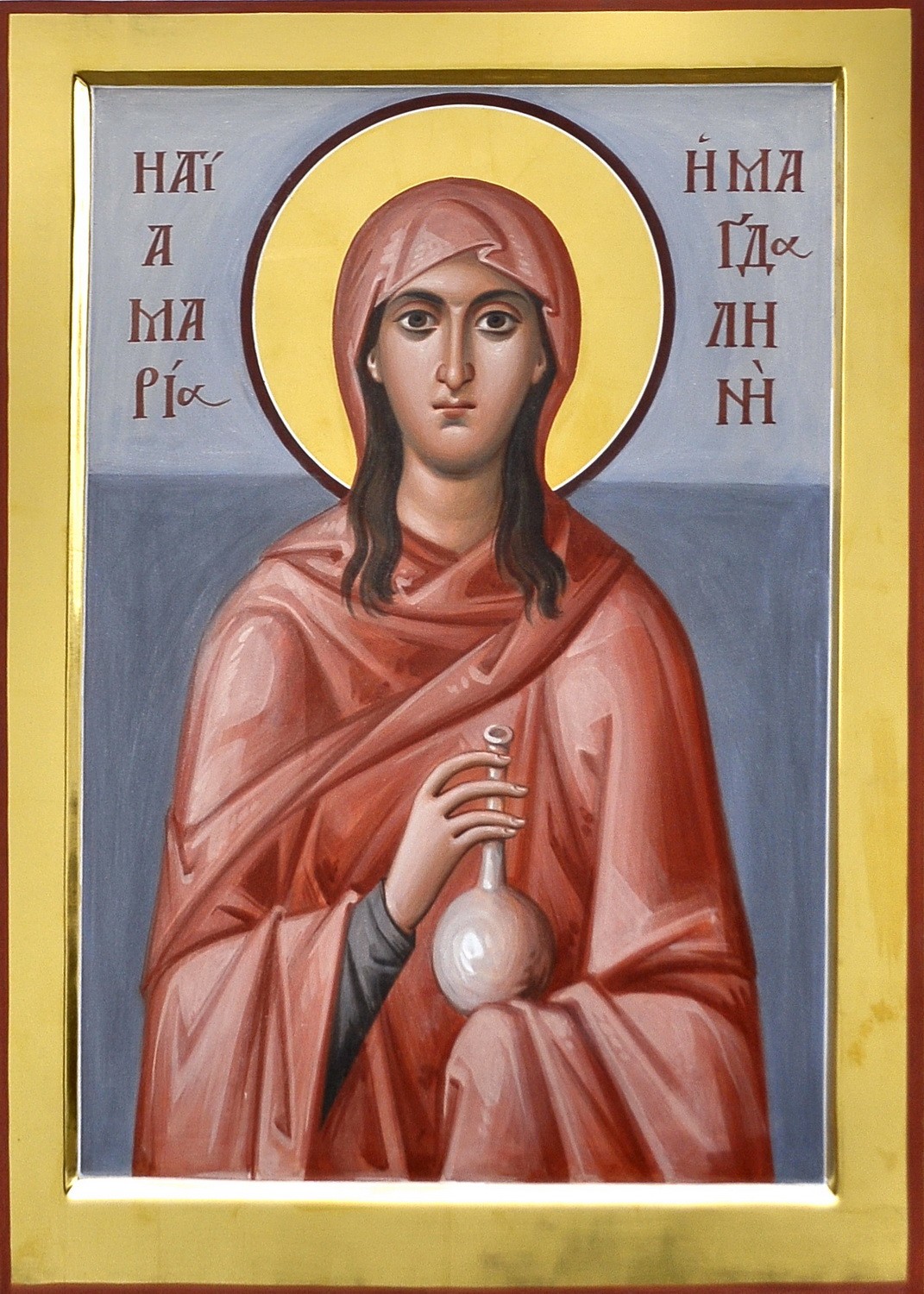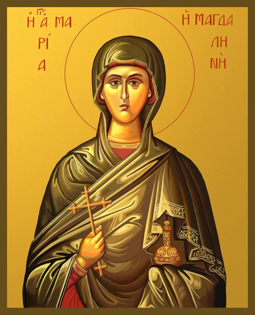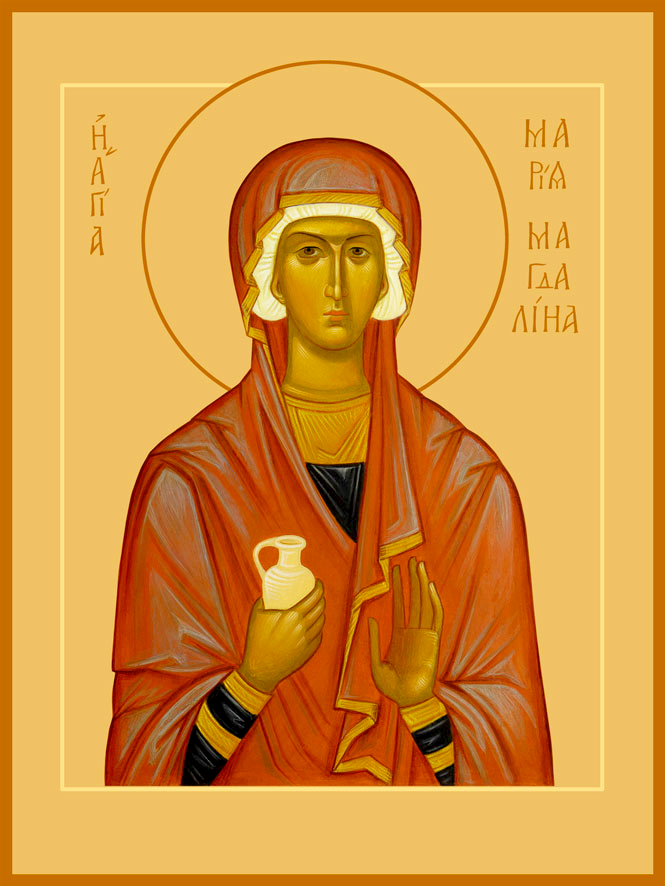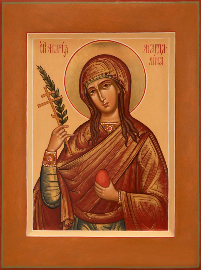 Святая Мария Магдалина следовала за Христом вместе с другими женами, исцеленными Господом, проявляя трогательную заботу о Нем. Она не оставила Господа после взятия Его иудеями, когда начала колебаться вера в Него ближайших учеников. Страх, побудивший к отречению апостола Петра, в душе Марии Магдалины был побежден любовью. Она стояла у Креста вместе с Пресвятой Богородицей и апостолом Иоанном, переживая страдания Божественного Учителя и приобщаясь великому горю Богоматери. Святая Мария Магдалина сопровождала Пречистое Тело Господа Иисуса Христа при перенесении Его ко гробу в саду праведного Иосифа Аримафейского, была при Его погребении (Мф.27:61; Мк.15:47). Служа Господу во время Его земной жизни, она желала послужить Ему и после смерти, воздав последние почести Его Телу, умастив его, по обычаю евреев, миром и ароматами (Лк.23:56). Воскресший Христос послал святую Марию с вестью от Него к ученикам, и блаженная жена, ликуя, возвестила апостолам о виденном – «Христос воскрес!» Как первая благовестница Христова воскресения, святая Мария Магдалина признана Церковью равноапостольной. В этом благовестии – главное событие ее жизни, начало ее апостольского служения.