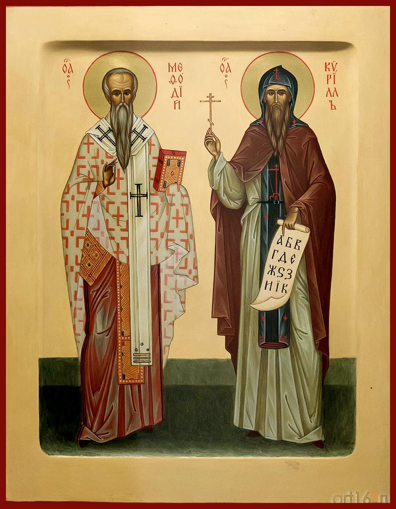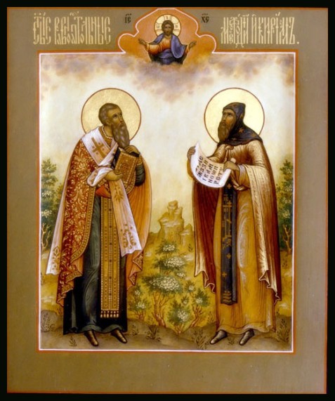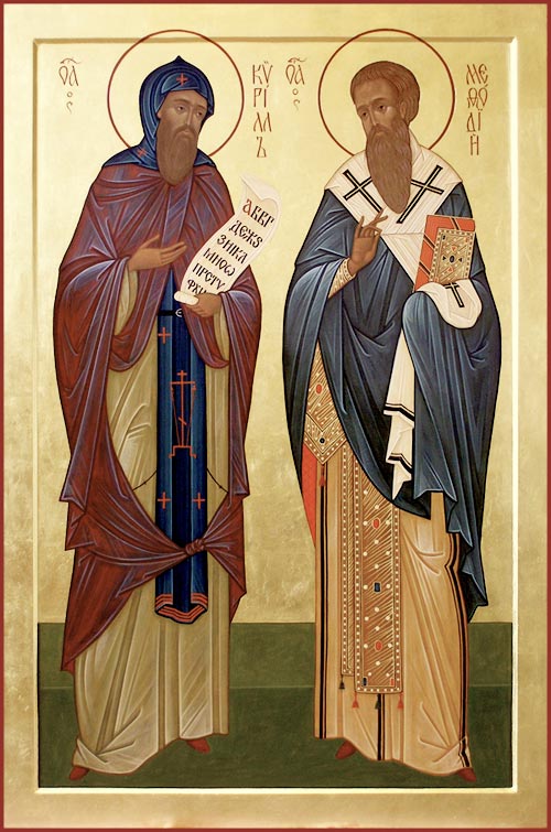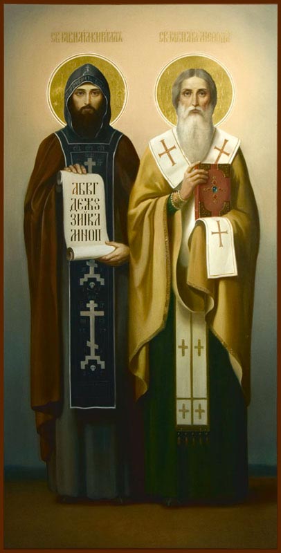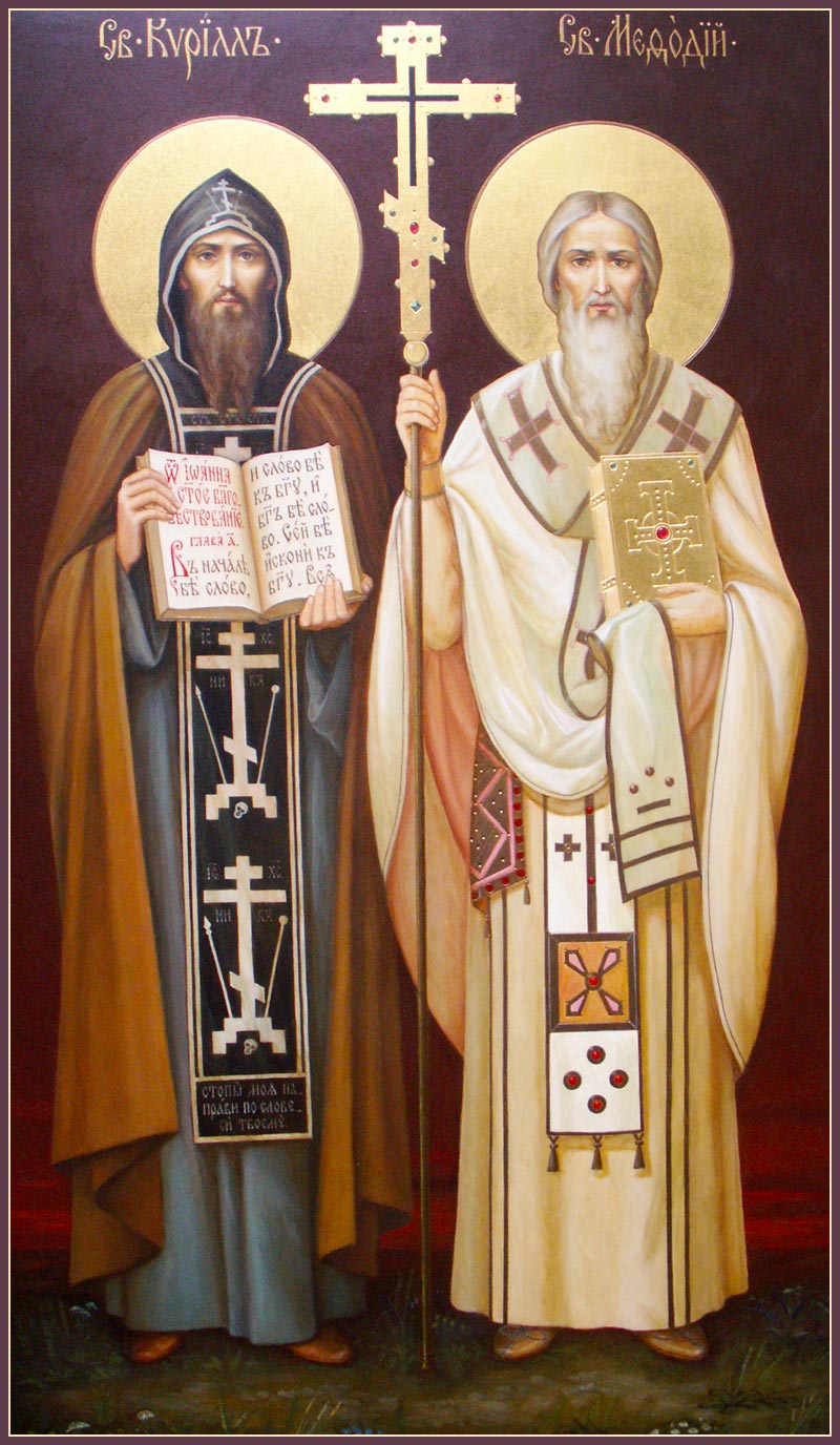 Святые равноапостольные первоучители и просветители славянские, братья Кирилл и Мефодий происходили из знатной и благочестивой семьи, жившей в греческом городе Солуни. Святой Мефодий был старшим из семи братьев, святой Константин (Кирилл – его монашеское имя) – самым младшим. Святой Мефодий был сначала в военном звании и был правителем в одном из подчиненных Византийской империи славянских княжеств, по-видимому, Болгарском, что дало ему возможность научиться славянскому языку. Пробыв там около 10 лет, святой Мефодий принял затем монашество в одном из монастырей на горе Олимп. Святой Константин с малых лет отличался большими способностями и учился вместе с малолетним императором Михаилом у лучших учителей Константинополя, в том числе у Фотия, будущего Патриарха Константинопольского. Святой Константин в совершенстве постиг все науки своего времени и многие языки, особенно прилежно изучал он творения святителя Григория Богослова. За свой ум и выдающиеся познания святой Константин получил прозвание Философа (мудрого). По окончании учения святой Константин принял сан иерея и был назначен хранителем патриаршей библиотеки при храме Святой Софии, но вскоре покинул столицу и тайно ушел в монастырь. Разысканный там и возвращенный в Константинополь, он был определен учителем философии в Высшей константинопольской школе. Мудрость и сила веры еще совсем молодого Константина были столь велики, что ему удалось победить в прениях вождя еретиков-иконоборцев Анния. После этой победы Константин был послан императором на диспут для прений о Святой Троице с сарацинами (мусульманами) и также одержал победу. Вернувшись, святой Константин удалился к брату своему святому Мефодию на Олимп, проводя время в непрестанной молитве и чтении творений святых отцов.Вскоре император вызвал обоих святых братьев из монастыря и отправил их к хазарам для евангельской проповеди. На пути они остановились на некоторое время в городе Корсуни, готовясь к проповеди. Там святые братья чудесным образом обрели мощи священномученика Климента, папы римского (память 25 ноября). Там же в Корсуни святой Константин нашел Евангелие и Псалтирь, написанные "русскими буквами", и человека, говорящего по-русски, и стал учиться у этого человека читать и говорить на его языке. После этого святые братья отправились к хазарам, где одержали победу в прениях с иудеями и мусульманами, проповедуя Евангельское учение. На пути домой братья снова посетили Корсунь и, взяв там мощи святого Климента, вернулись в Константинополь. Святой Константин остался в столице, а святой Мефодий получил игуменство в небольшом монастыре Полихрон, недалеко от горы Олимп, где он подвизался прежде.Вскоре пришли к императору послы от моравского князя Ростислава, притесняемого немецкими епископами, с просьбой прислать в Моравию учителей, которые могли бы проповедовать на родном для славян языке. Император призвал святого Константина и сказал ему: "Необходимо тебе идти туда, ибо лучше тебя никто этого не выполнит". Святой Константин с постом и молитвой приступил к новому подвигу. С помощью своего брата святого Мефодия и учеников Горазда, Климента, Саввы, Наума и Ангеляра он составил славянскую азбуку и перевел на славянский язык книги, без которых не могло совершаться Богослужение: Евангелие, Апостол, Пс