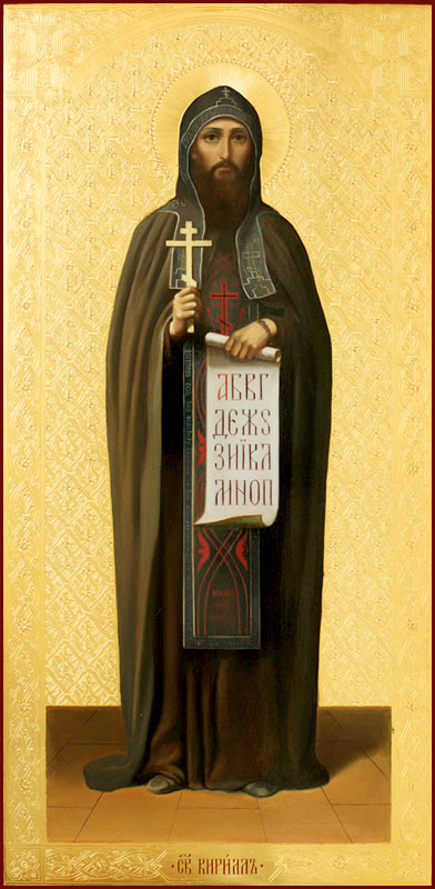 Святой равноапостольный Кирилл, учитель словенский (до принятия схимы – Константин) и старший брат его Мефодий (память 6 апреля) по происхождению славяне, родились в Македонии, в городе Солуни. Святой Кирилл получил блестящее образование, с 14-летнего возраста воспитываясь с сыном императора. Он рано принял сан пресвитера. По возвращении в Константинополь состоял библиотекарем соборной церкви и преподавателем философии. Святой Кирилл с успехом вел прения с еретиками иконоборцами и с магометанами. Стремясь к уединению, он удалился на гору Олимп к своему старшему брату Мефодию, но уединение его продолжалось недолгое время. Оба брата были посланы в 857 году императором Михаилом в миссионерское путешествие для проповеди христианства у хозар. По дороге они останавливались в Херсоне и обрели там мощи священномученика Климента, Папы Римского. Прибыв к хозарам, святые братья беседовали с ними о христианской вере. Убежденный проповедью святого Кирилла хозарский князь и с ним весь народ приняли христианство. Благодарный князь хотел наградить проповедников богатыми дарами, но они отказались от этого и просили князя отпустить с ними на родину всех греческих пленников. Святой Кирилл вернулся в Константинополь с 200 отпущенными пленниками.В 862 году началось главное дело святых братьев. По просьбе князя Ростислава император послал их в Моравию для проповеди христианства на славянском языке. Святые Кирилл и Мефодий по откровению Божию составили славянскую азбуку и перевели на славянский язык Евангелие, Апостол, Псалтирь и многие Богослужебные книги. Они ввели богослужение на славянском языке. Затем святые братья были вызваны в Рим по приглашению Римского Папы, где Папа Адриан встретил их с великой честью, ибо они принесли туда мощи священномученика Климента, Папы Римского. По природе болезненный и слабый, святой Кирилл от многих трудов вскоре заболел и, приняв схиму, скончался в 869 году 42-х лет.Перед смертью он завещал своему брату продолжить христианское просвещение славян. Погребен святой Кирилл в римской церкви святого Климента, где почивают мощи этого священномученика, принесенные в Италию из Херсонеса словенскими учителями.