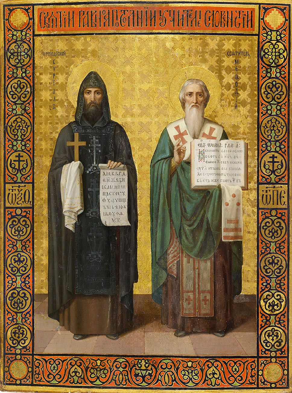 О, преславнии язык словенских учителие и просветителие, святии равноапостольнии Мефодие и Кирилле. К вам, яко чада ко отцем, светом учений и писмен ваших просвещеннии и в вере Христовой наставленнии, ныне усердно прибегаем и в сокрушении сердец наших молимся. Аще бо и завет ваших, яко чада непокоривая, не соблюдохом и о угождении Богу, якоже учисте, небрегохом, и от единомыслия и любве, юже словеном, яко братиям в вере и по плоти, добре завещаете, отпадохом, обаче, якоже древле в житии вашем неблагодарных и недостойных не отвращасте тщи, но благими за злая воздавасте, тако и ныне грешных и недостойных чад ваших молитвы не отвратите, но, яко велие имуще дерзновение ко Господу, прилежно Того молите, да наставит и обратит нас на путь спасения, распри же и раздоры, посреде единоверных братий возникающия, умирит, отпадшия паки во единомыслие приведет и всех нас единением духа и любве во единей, Святей, Соборней и Апостольстей Церкви соединит. Вемы бо, вемы, яко много может молитва праведника ко благосердию Владыки, аще и о грешных людех приносима бывает. Не оставите убо нас, унылых и недостойных чад ваших, ихже грех ради паства ваша, вами собранная, враждою разделяема и соблазны от иноверных прельщаема, умалися, овцы же ея словесныя разсеваемы, от волков мысленных восхищаются, дадите убо нам молитвами вашими о православии ревность, да ею возгреваеми, отеческая предания добре сохраним, уставы и обычаи церковныя верно соблюдати потщимся, всяких лжеучений странных отбежим и тако, в житии богоугоднем на земли преспевающе, жизни райския на небеси сподобимся, и тамо с вами вкупе Владыку всех, в Троице Единаго Бога прославим во веки веков. Аминь.