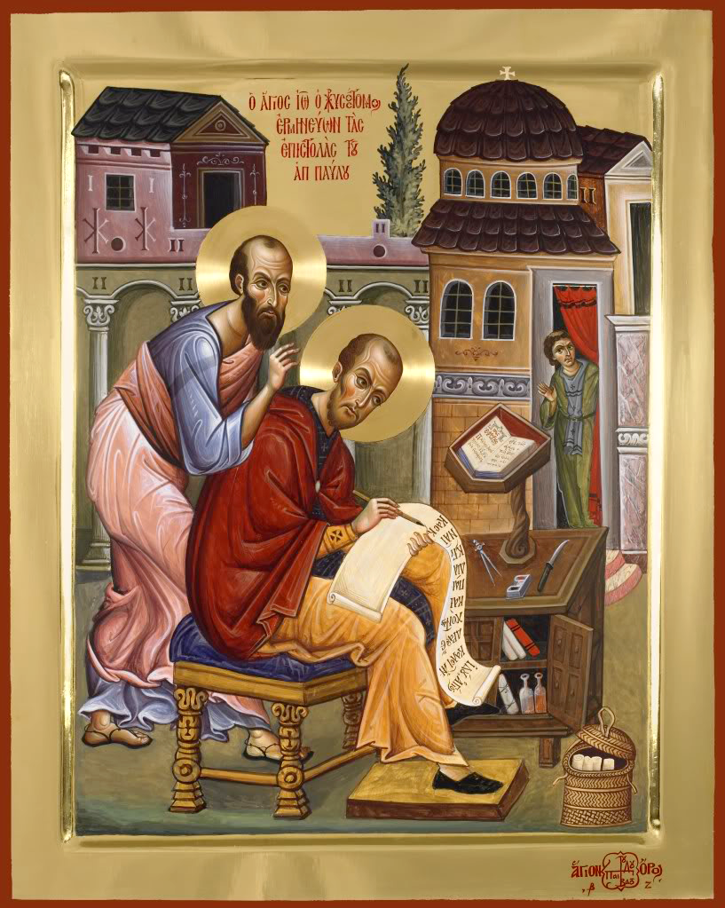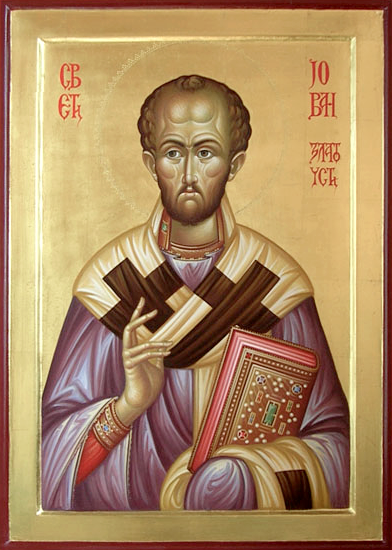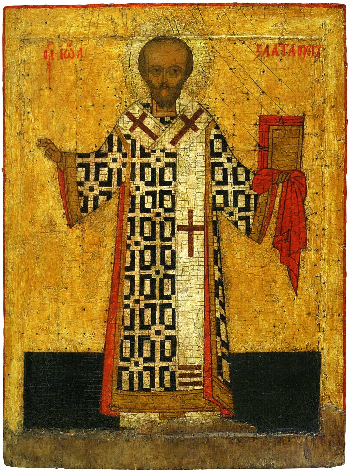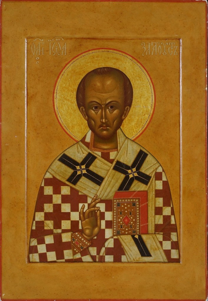 Златозарнаго и златословеснаго, почтим Златоустаго Иоанна, вся позлатившаго златовидными сиянии учения и мир языком просветивша, злата светлейшим и света полнейшим, источающим благодать Божественную.
