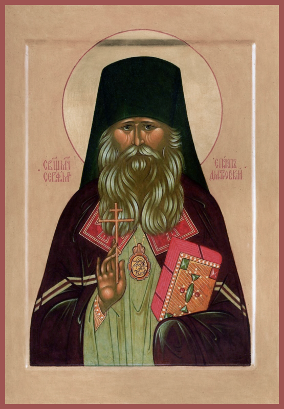 Возсиял еси, яко светило пресветлое, во граде Дмитрове, святителю отче Серафиме, светом Христова учения соблюдая паству твою от наветов вражиих, расколов и ересей. Темже, ведуще тя, яко пастыря и учителя богомудраго, теплаго молитвенника и пред Богом усерднаго ходатая, песньми духовными прославляем тя сице: