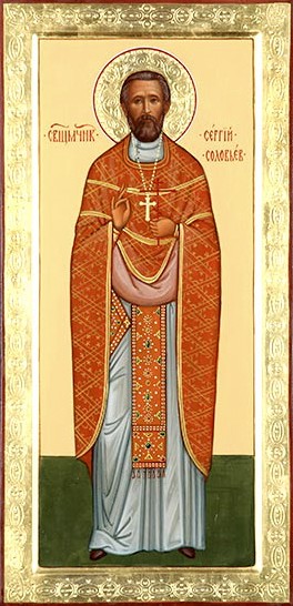 Священномученик Сергий родился 26 сентября 1883 года в селе Шубино Бронницкого уезда Московской губернии в семье священника Михаила Константиновича и его супруги Екатерины Дмитриевны Соловьевых; у них было десять человек детей, и все сыновья в разные годы окончили Московскую Духовную семинарию. Священник Михаил Соловьев был рукоположен к Успенскому храму в селе Шубино в 1876 году и прослужил здесь всю жизнь. Успенская церковь была построена в 1794 году тщанием и на средства крестьян. Трудами отца Михаила храм был расписан и в боковых приделах возведены иконостасы. Главной святыней храма была чудотворная икона Божией Матери «Плакущая», которая прославилась исцелениями во время эпидемии холеры в 1848 году. С тех пор ежегодно 14 июня в храме стало совершаться всенощное бдение и на следующий день Божественная литургия с крестным ходом и водосвятием. В храме были особо чтимые иконы Спаса Оплечного и святителя Феодосия Черниговского. В иконе святителя Феодосия имелась часть его ризы и ленты, на которой несли его гроб. В 1893 году отец Михаил был назначен благочинным Бронницкого уезда.В 1894 году его сын Сергей поступил в Донское духовное училище, которое окончил в 1899 году; в 1906 году он окончил Московскую Духовную семинарию и был определен учителем в двухклассную школу при Николо-Угрешском монастыре, одновременно состоя законоучителем братии того же монастыря. Вскоре Сергей Михайлович женился, и у них с женой родилась дочь.26 августа 1910 года митрополит Московский Владимир (Богоявленский) определил Сергея Михайловича во священника к Успенской церкви в село Шубино, а 17 октября того же года епископ Трифон (Туркестанов) рукоположил его во священника. В Успенском храме отец Сергий прослужил всю свою жизнь. До начала гонений от безбожников он преподавал в церковноприходской и земской школах.В 1923 году число прихожан из села Шубино и входящих в приход деревень Борисово, Заменье, Скрипино, Мотякино, Пестово, Базушно составляло тысячу триста сорок человек. В 1923 году отец Сергий был назначен благочинным 4-го округа Бронницкого уезда. К этому времени у него скончалась супруга и на его иждивении осталась дочь, которой исполнилось тогда всего десять лет.В конце двадцатых годов власти сделали попытку закрыть Успенскую церковь, но отцу Сергию и прихожанам удалось тогда отстоять храм от закрытия. Во время гонений в конце тридцатых годов власти стали собирать материал для ареста священника. 21 января 1938 года был допрошен в качестве лжесвидетеля священник села Салтыково Бронницкого района Василий Крестов, который дал необходимые для следователя показания. 26 января власти арестовали отца Сергия и заключили в коломенскую тюрьму. 31 января он был допрошен. На требования следователя признать себя виновным в антисоветской контрреволюционной деятельности священник ответил категорическим отказом. 11 февраля тройка НКВД приговорила отца Сергия к расстрелу. Священник Сергий Соловьев был расстрелян 17 февраля 1938 года и погребен в безвестной общей могиле на полигоне Бутово под Москвой.