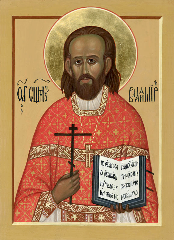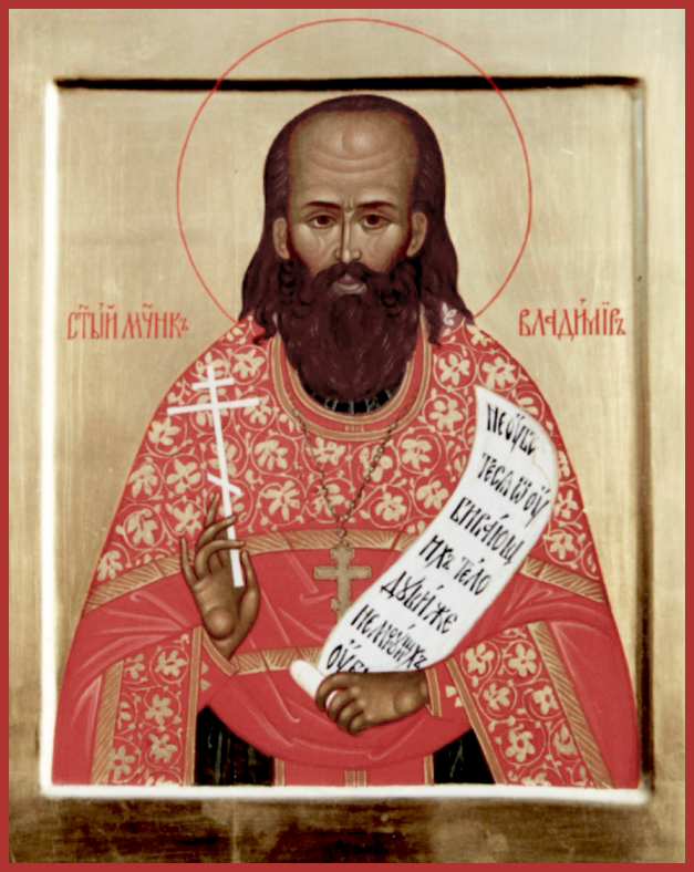 О, святый священномучениче Владимире, избранный учениче и последователю Христов, верою, яко светильником, озаривый весь путь жития твоего, наипаче же в темную годину гонений, егда и смерть за веру претерпел еси и возшел еси к свету Богообщения, идеже лицем зриши Бога, Емуже послужил еси. Благодать возприял еси, веру убо, в нейже бе воспитан умножив, крещением истинным крестился еси, и крест священнический на перси восприяв, на крест Голгофский возшел еси, от силы веры выну в силу любве восходя, ближним убо послужил еси, узники и больныя утешив, верныя от раскола сохранив и други твоя от безбожных гонителей сокрыв. Темже приими и нашу молитву, чад твоих, Бога о тебе благодарящих, Господь бо не сокры подвига твоего от нас, и прославити тя благослови, и сродники твоя молитвами твоими Церкви всяко послужити сподоби. Темже молися и ныне Владыце Христу, священники умудрити и от разделений соблюсти, монашествующия в подвизе укрепити, дети от пагубных наветов бесовских сохранити и вся верныя в православии утвердити, и сию веру отцев непреложну до конца нам соблюсти, да прославим купно с тобою на Небесех Отца и Сына и Святаго Духа, ныне и присно и во веки веков. Аминь.