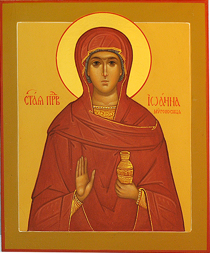 Святая Иоанна Мироносица, супруга Хузы, домоправителя царя Ирода, была одной из жен, следовавших за Господом Иисусом Христом во время Его проповеди, и служила Ему. Вместе с другими женами после Крестной смерти Спасителя святая Иоанна приходила ко Гробу, чтобы помазать миром Святое Тело Господа, и слышала от Ангелов радостную весть о Его славном Воскресении.