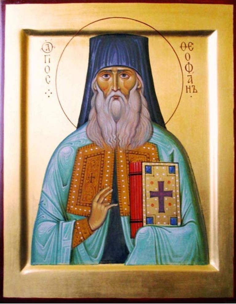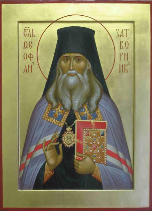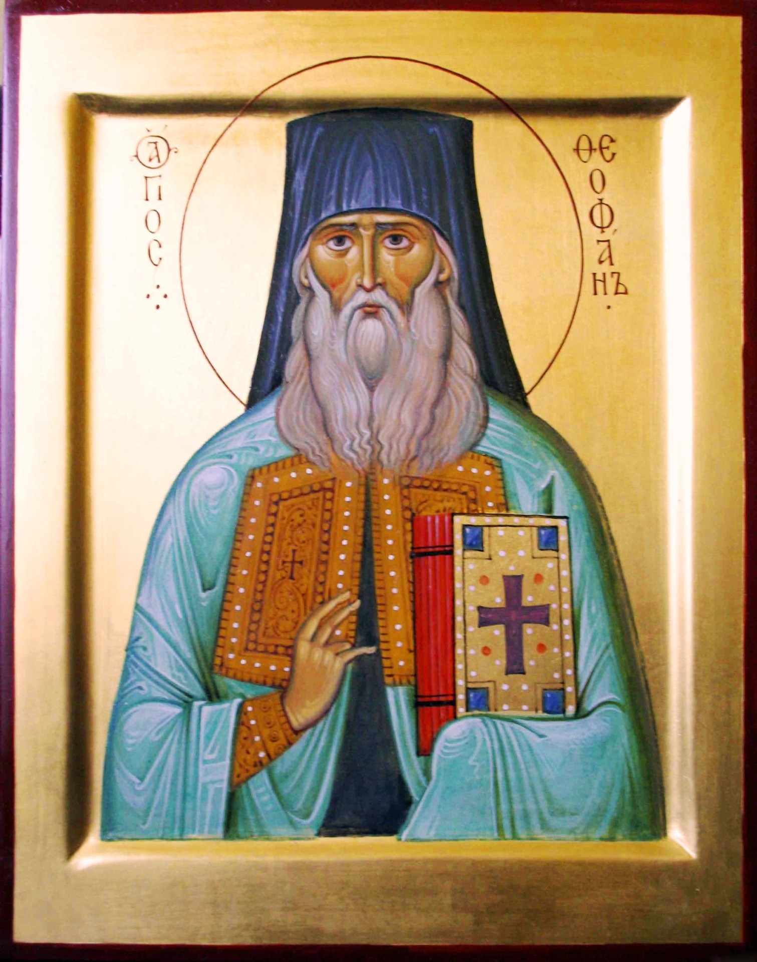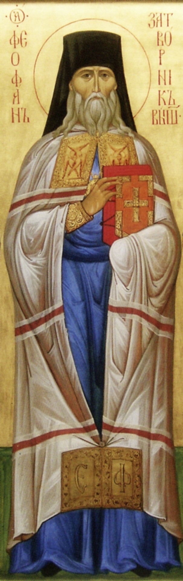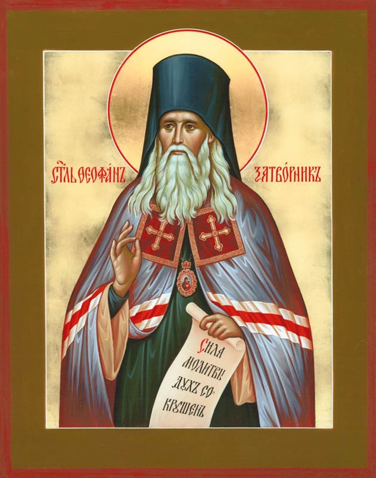 О, святи́телю о́тче Феофа́не, архиере́ю пресла́вный и преди́вный затво́рниче, Бо́жий избра́нниче и Тайн Христо́вых служи́телю, богому́дрый учи́телю и апо́стольских слове́с изря́дный изъясни́телю, оте́ческих добротолю́бных сказа́ний описа́телю, христиа́нского благоче́стия изя́щный пропове́дниче и жи́зни духо́вныя иску́сный наста́вниче, по́двигов мона́шеских усе́рдный ревни́телю и всем лю́дем благода́ти хода́таю! Ны́не к тебе́, на Небесе́х Бо́гу предстоя́щему и о нас моля́щемуся припа́даем и си́це взыва́ем: испроси́ у Всеще́драго Бо́га Це́ркви Росси́йстей и стране́ на́шей мир и благостоя́ние, святи́телем Христо́вым — и́стины Боже́ственныя досто́йное охране́ние, па́ствы до́брое окормл'ение, лжеучи́телей и еретико́в изря́дное посрамле́ние, подвиза́ющимся — смире́ние, страх Бо́жий и чистоту́ душе́вную и теле́сную, учи́телем — богове́дение и му́дрость, уча́щимся — ре́вность и по́мощь Бо́жию. И всем правосла́вным — утвержде́ние на пути́ ко спасе́нию, да вку́пе с тобо́ю просла́вим Бо́жию Си́лу и Прему́дрость Го́спода на́шего Иису́са Христа́, со Безнача́льным Его́ Отце́м, со Пресвяты́м, Благи́м и Животворя́щим Его́ Ду́хом, ны́не и при́сно, и во ве́ки веко́в. Ами́нь.