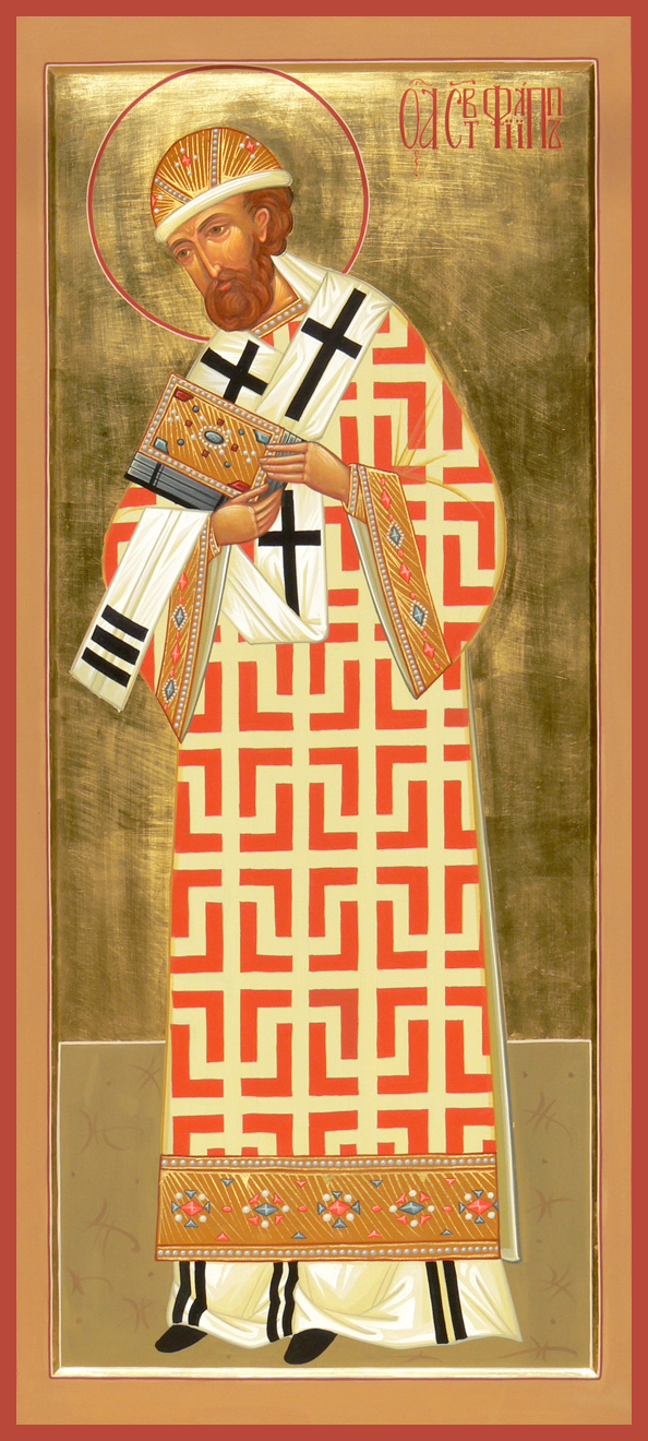 Православия наставника и истины провозвестника, Златоустаго ревнителя, Российскаго светильника, Филиппа премудраго восхвалим, пищею словес своих разумно чада своя питающа, тоя бо языком хваление пояше, устнама же пение вещаше, яко таинник Божия благодати.