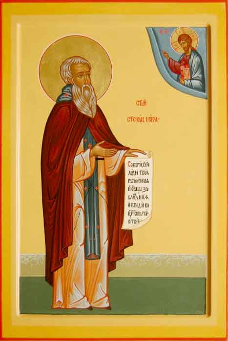 Возсия христианское благочестие в земли, растленней идолослужением, егда начал еси Божественное семя в безбожных сеяти, и утверждая их в вере истинней примером своим, всего себе посвятил еси Богу; мы же похвальная восписуем ти: Радуйся, волю, ищущую нетления, стяжавый; Радуйся, главу горния мудрости исполнивый. Радуйся, земная мудрования презревый; Радуйся, очи от мирския прелести отвративый. Радуйся, уста на хваление Господа употребивый; Радуйся, язык к божественней проповеди устроивый. Радуйся, руце прострый на молитву и подаяние милостыни; Радуйся, теми же множество книг душеспасительных написавый. Радуйся, сердце твое постом и молитвою в жилище Духа Святаго уготовавый; Радуйся, нозе ко бдению и благовествованию мира направивый. Радуйся, все твое тело воздержанием удручивый; Радуйся, непрестанным богомыслием душу и тело освятивый. Радуйся, Стефане, великий чудотворче.