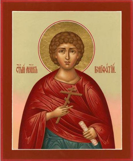 Святой мученик Вонифатий был рабом богатой молодой римлянки Аглаиды и состоял с ней в беззаконном сожительстве. Но оба они чувствовали угрызения совести и хотели как-то омыть свой грех. И Господь пожалел их и дал им возможность очистить грехи своей кровью и закончить грешную жизнь покаянием. Аглаида узнала, что если с благоговением хранить в доме мощи святых мучеников, то их молитвами легче получить спасение, ибо под их благодатным воздействием умаляются грехи и воцаряются добродетели. Она снарядила Вонифатия на Восток, где в то время шло жестокое гонение на христиан, и просила привезти мощи какого-либо мученика, чтобы он стал их руководителем и покровителем. Вонифатий на прощание, смеясь, спросил; «А что, госпожа, если я не найду мощей, а сам пострадаю за Христа, примешь ли ты мое тело с честью?» Аглаида отнеслась серьезно к его словам и укорила его в том, что он, отправляясь на святое дело, позволяет себе вольности. Вонифатий задумался над ее словами и всё время пути был сосредоточенным.